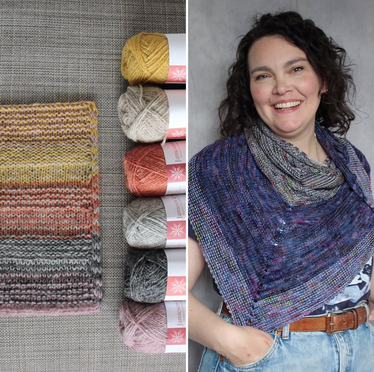 This top-down shawl is worked using a “double-pass” method, which helps to blend the colours of the yarn in single row stripes through garter stitch, stocking stitch and reverse stocking stitch sections. This technique is fully explained.