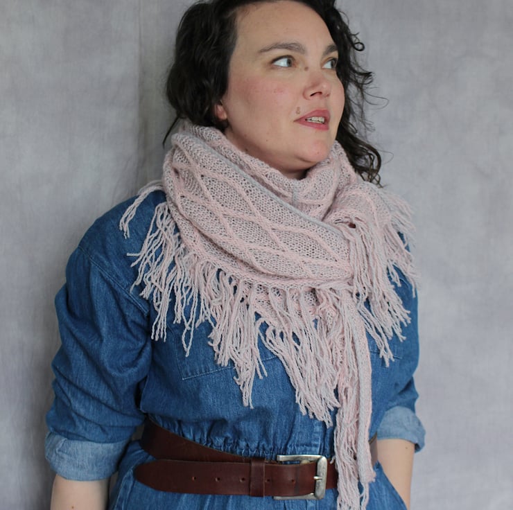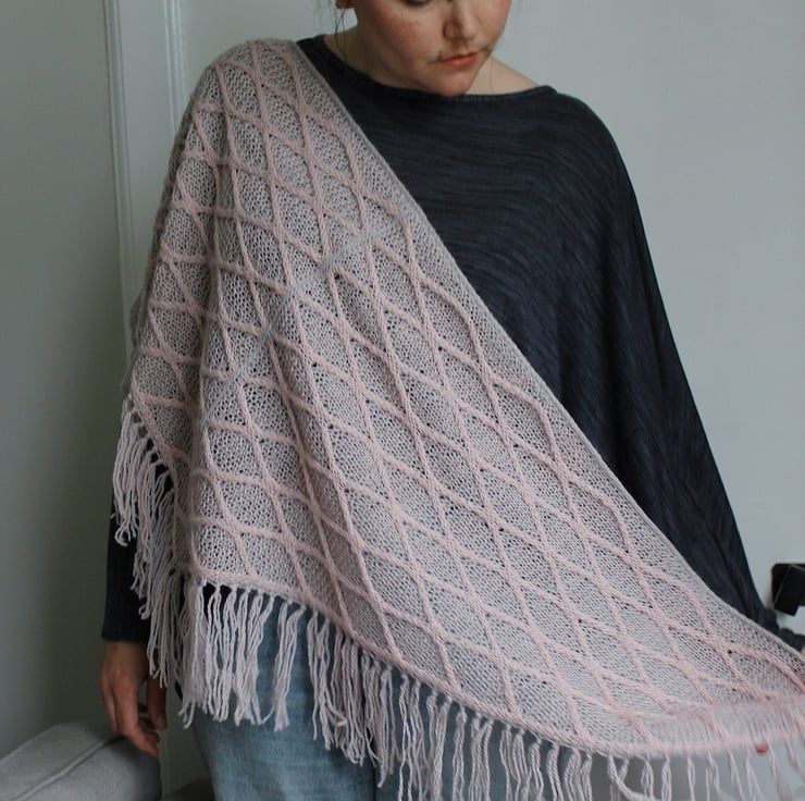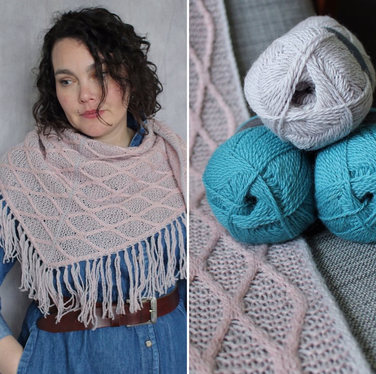 Inspired by the shapes and textures of pieced- patchwork quilts, Wild Rye is an airy triangular shawl featuring beautifully graphic slipped-stitch cables in a diamond patterning, that stand proud of a garter stitch background.