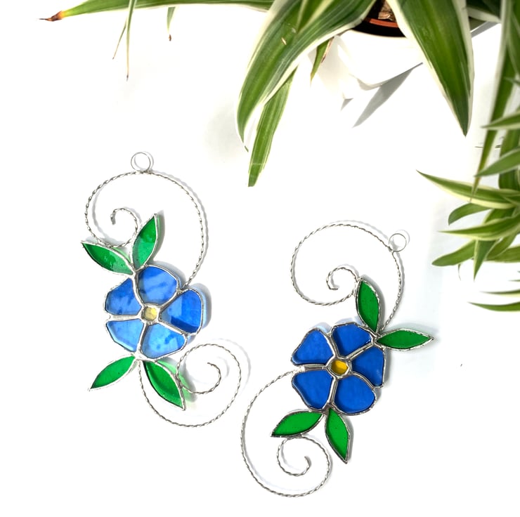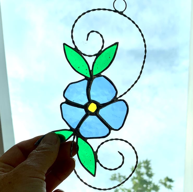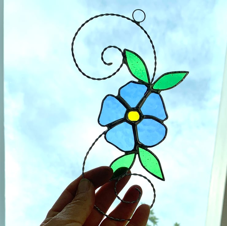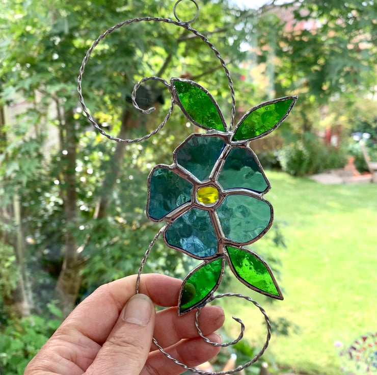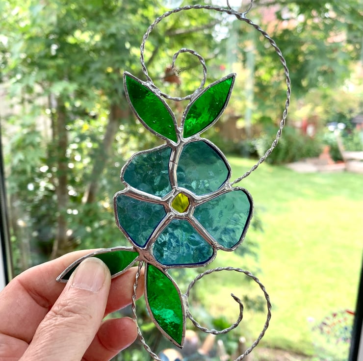 This suncatcher has been made from pale blue corella glass with yellow water glass for the centre and green glass for the lives. Twisted wired scrolls have been added to extra interest and hanging purposes.