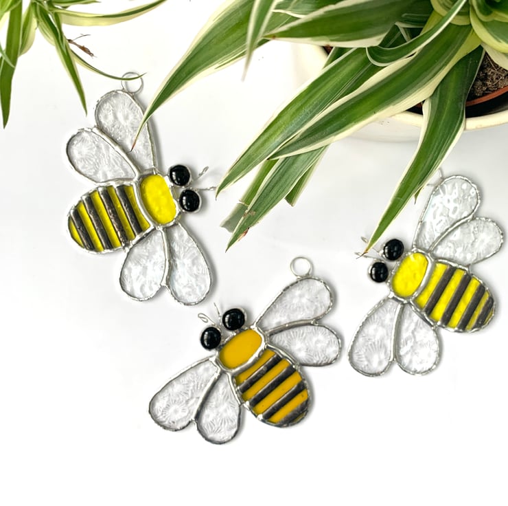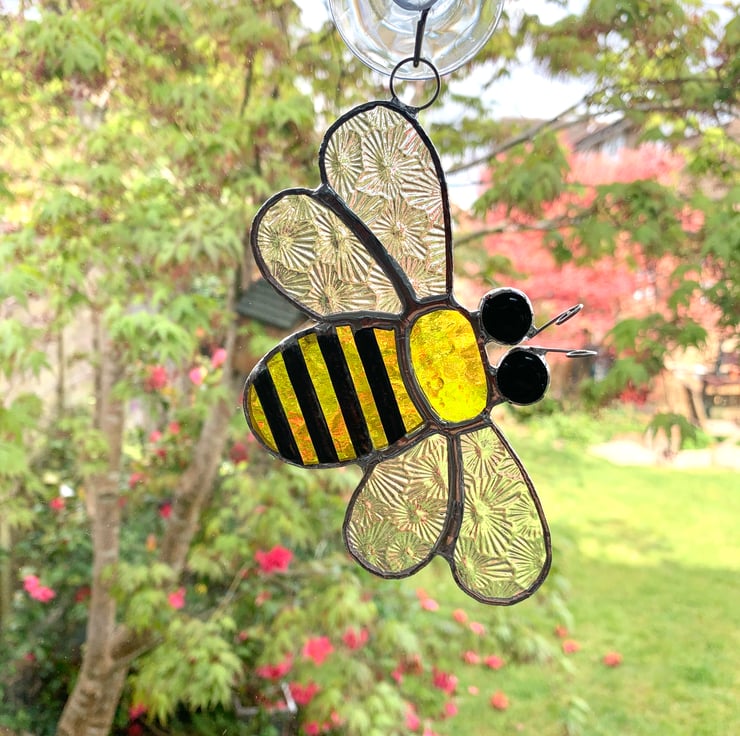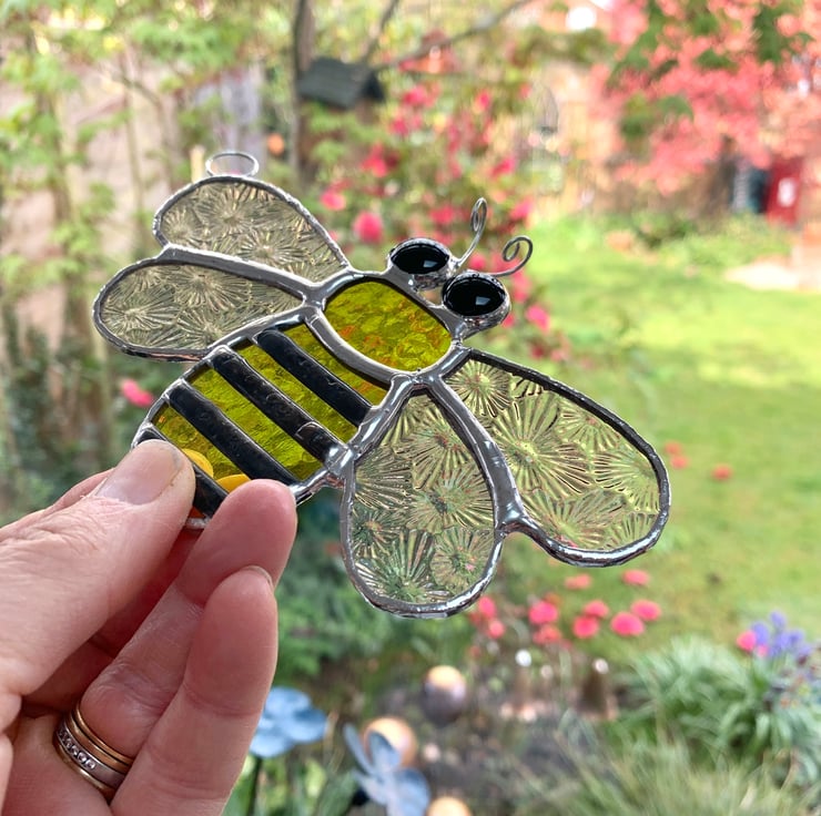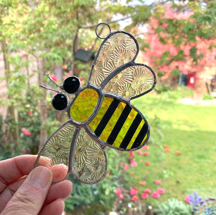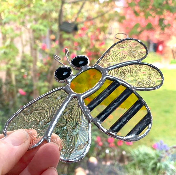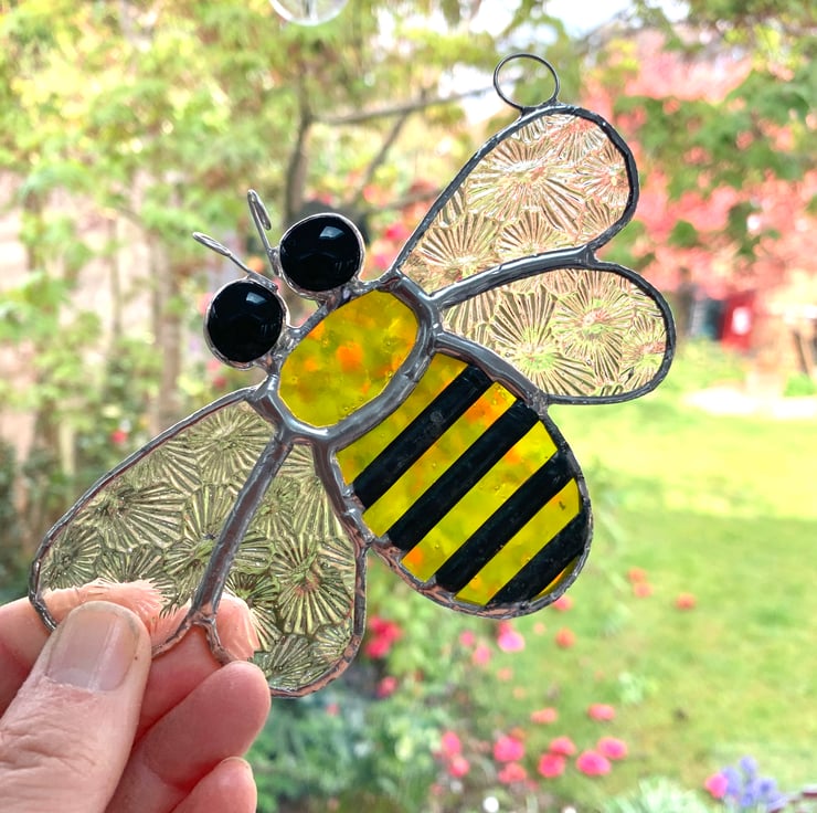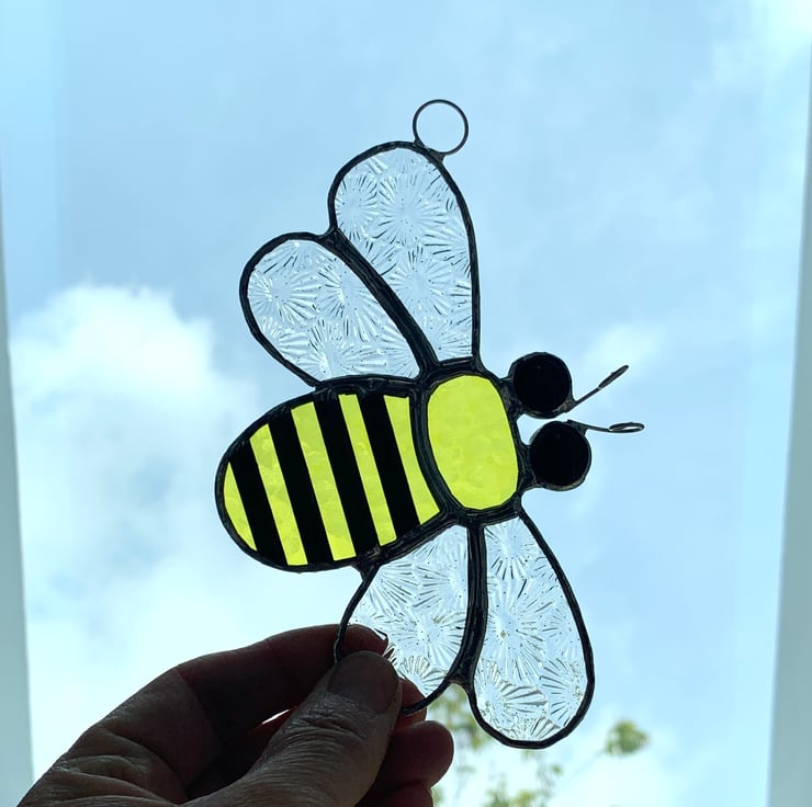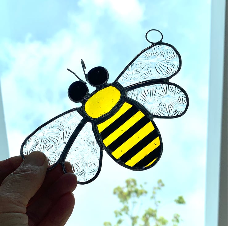 This suncatcher has made by cutting the glass by hand, grinding each piece to remove any sharp edges, washing, foiling with copper foil, soldering and then washing again. A patina has been applied to the stripes to blacken them. The glass used for this bee is either textured yellow corella glass or Yellow Sea glass for the body and clear florentine glass for the wings.