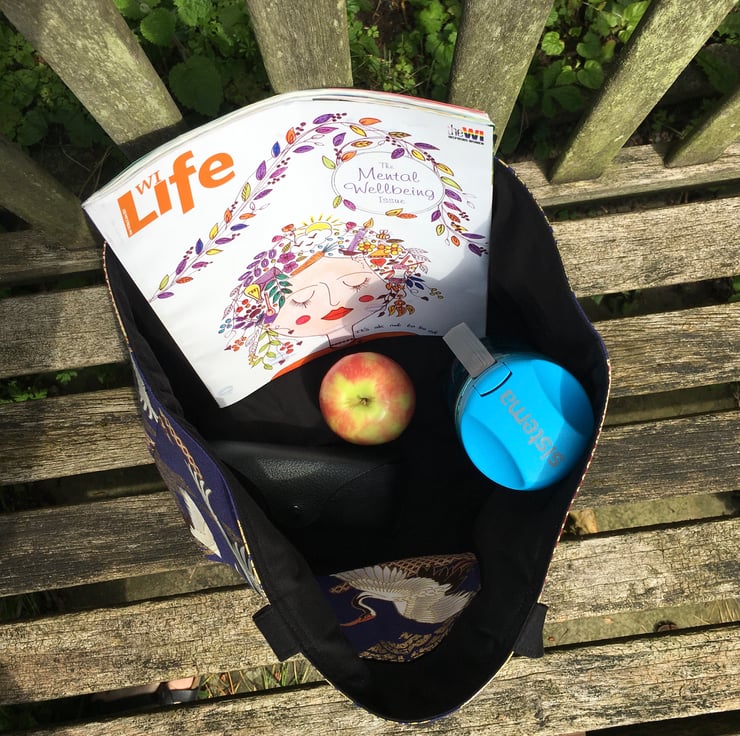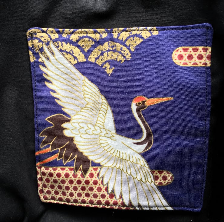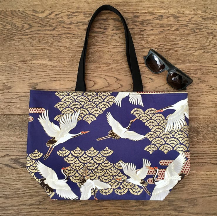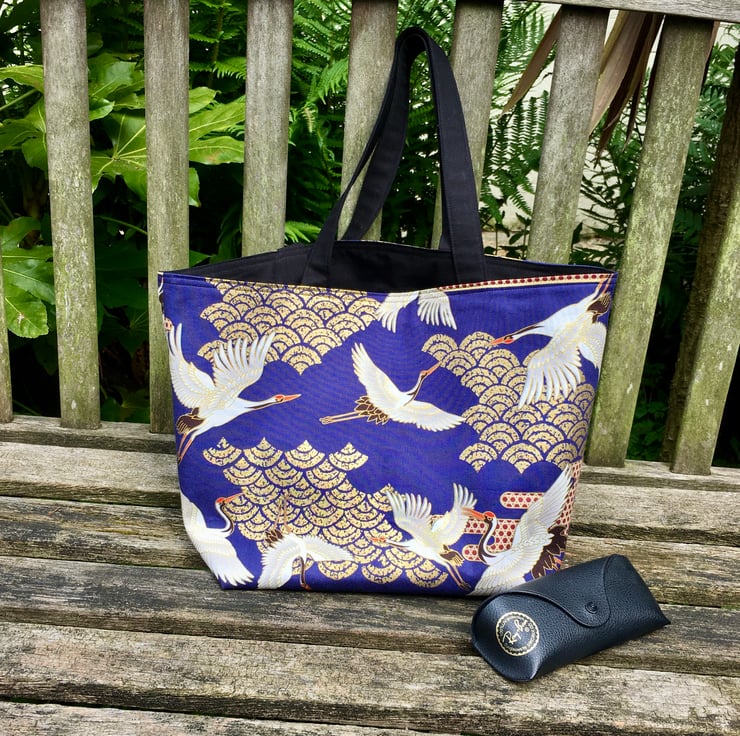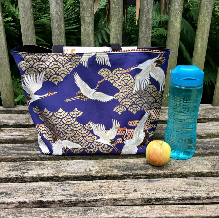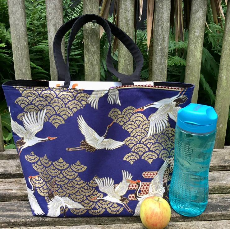 The bag is lined with black cotton fabric and has an inner pocket using the crane fabric. Interfacing has been used in the creation of the bag to give it more structure.