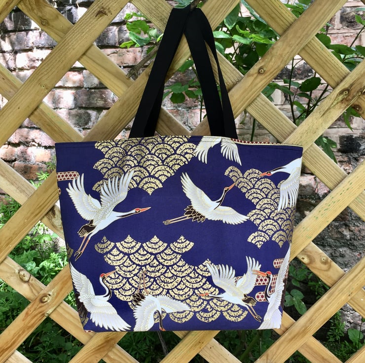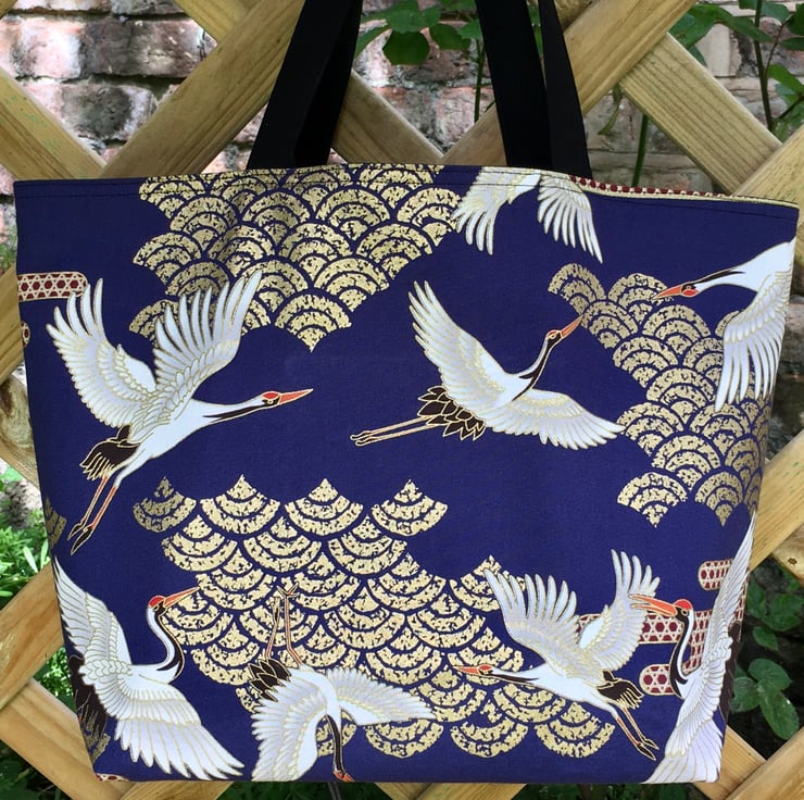 A stand out tote bag made from gilded Japanese fabric depicting white and black cranes with an orange beak and red cap flying above gold waves on a blue background. The fabric has been imported from Japan.