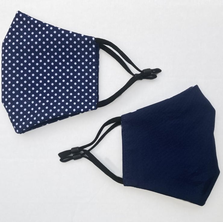 This is a double sided face mask, made from a navy blue fabric with white polka dots on one side and plain navy blue fabric on the other.