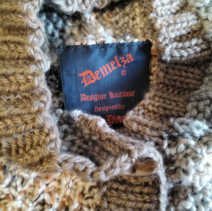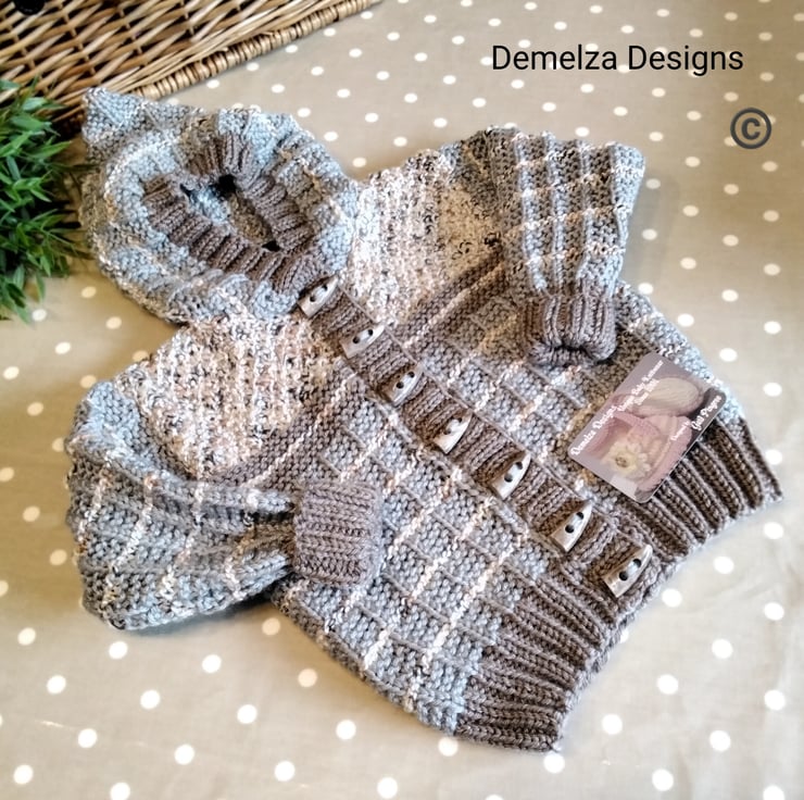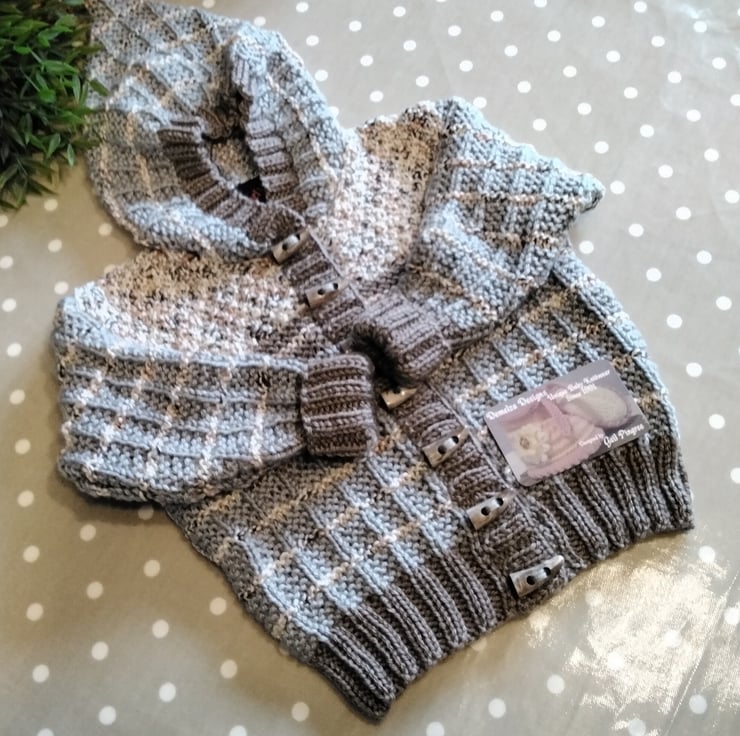 A beautifully designed toddler's aran weight hooded jacket hand knitted for total individuality for those seeking something different which has not be been mass produced by the thousands; often in third world countries by young children! The buttons are an unusual toggle style matching the colours in the yarns perfectly. The main colour British manufactured yarn has a silky touch and look whilst the multicoloured yarn has a distinctive slub adding texture to the design. The jacket has the Demelza branded garment label attached to the back neck edge with the care instructions woven within it on the reverse side for lasting reference.