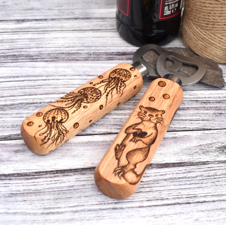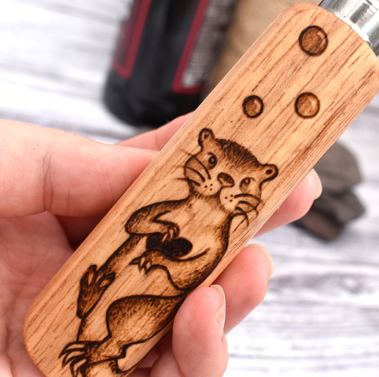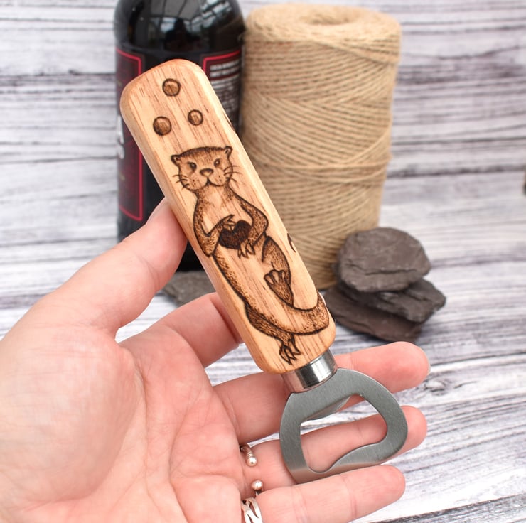 A cute, yet unusual bottle opener with a wooden handle, burned using pyrography. It features a sweet heart holding otter on both front and back.