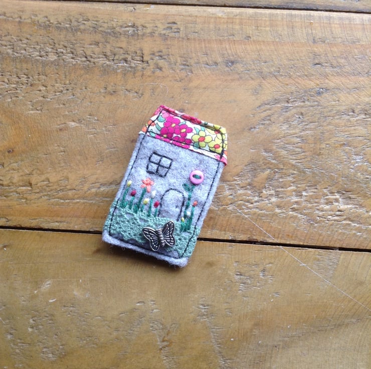 This little house felt brooch has a Liberty fabric roof and a hand embroidered and button garden. It is embellished with crochet lace and a Tibetan silver butterfly charm bead.