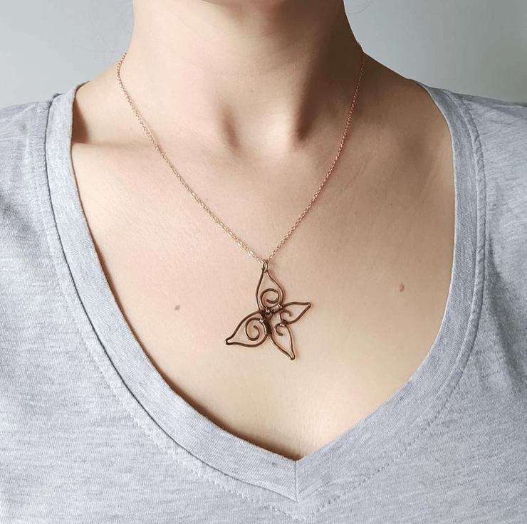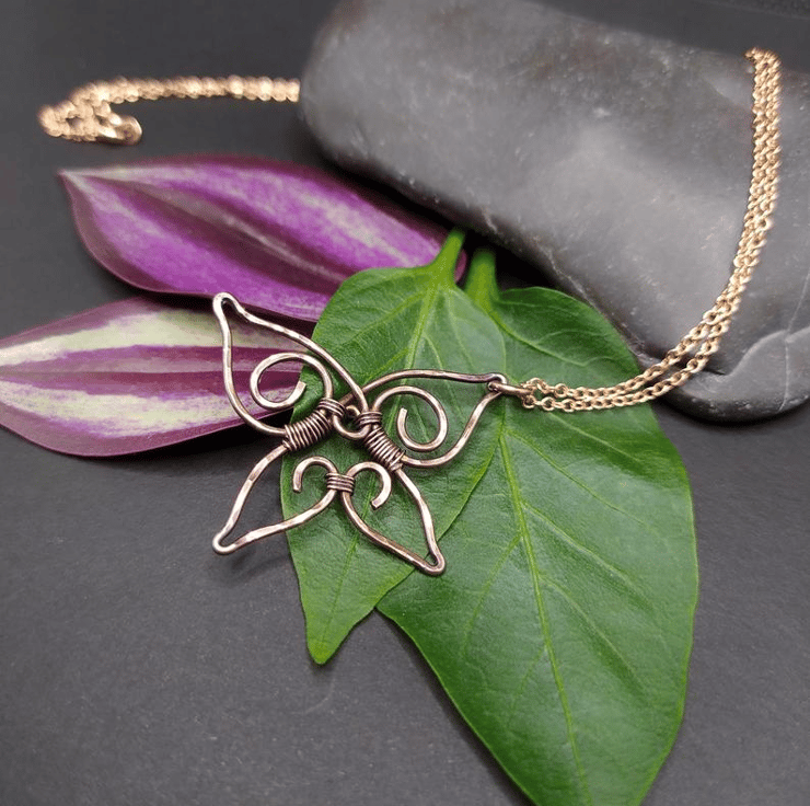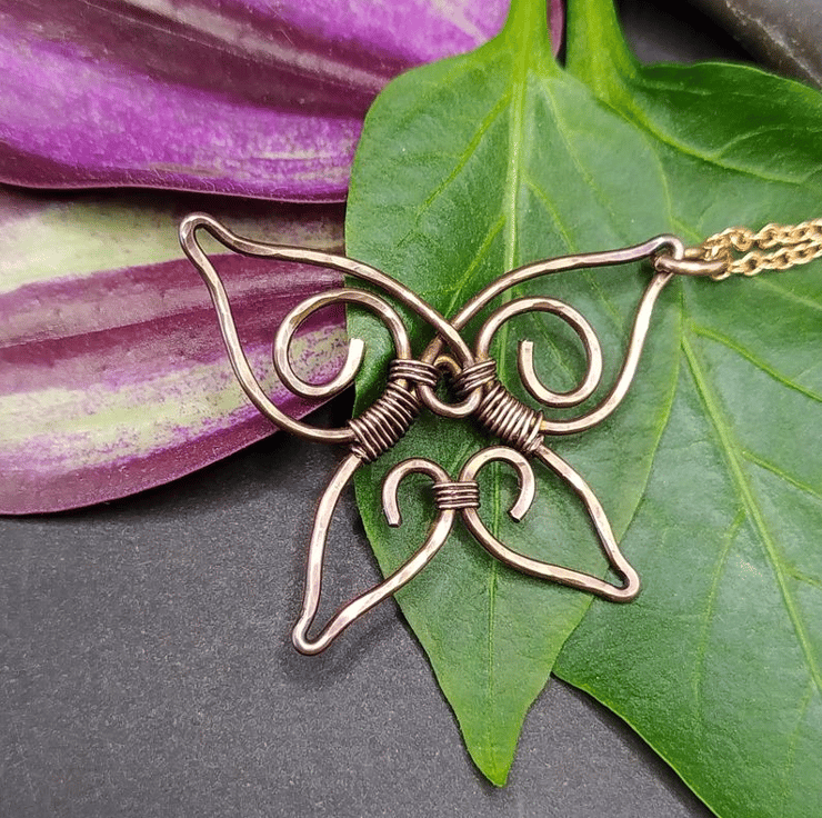 Butterfly shaped pendant necklace made from oxidised copper wire. Swirly filigree style wire wrapped design, a delicate handmade piece that makes a statement at the same time.