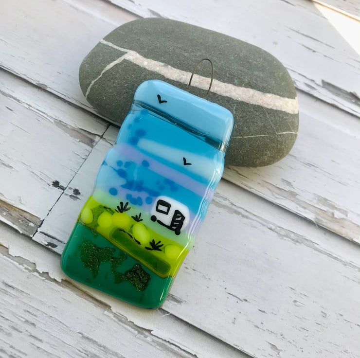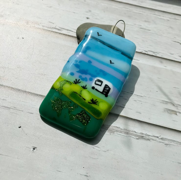 A small fused glass suncatcher featuring a caravan. It would look lovely hanging in the window or on the wall and makes an ideal gift for a caravan owner. This is a handmade item, I have individually cut each piece of coloured glass and then fully fused it in the kiln once cold I then hand-painted with enamel the caravan details. It measures approximately 8 cm x 4 cm.