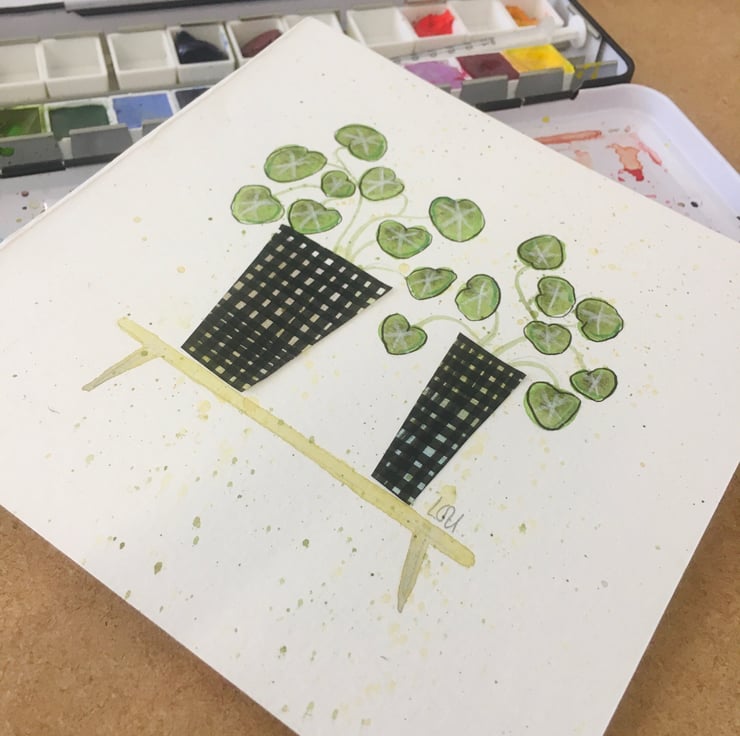 These are such fun to make. Making the collage papers can get a little messy but it’s great to experiment with different materials and just see what happens. I then use them to cut out shapes, in this example it’s the flowerpots. The plants are then painted with good quality watercolour paints.