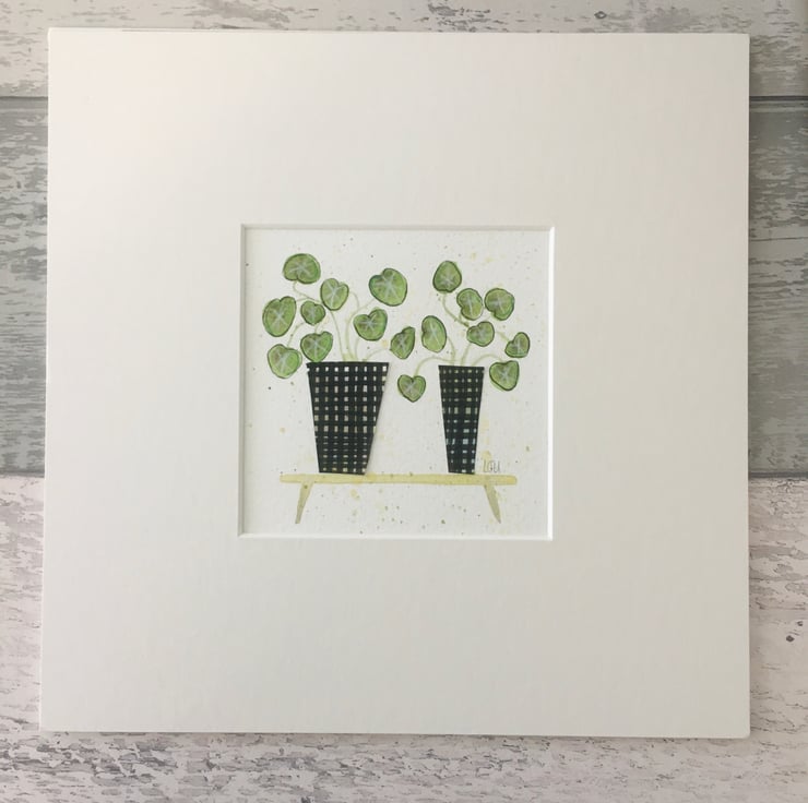 A beautiful money plant duo created using hand painted collage papers, Watercolour and ink.