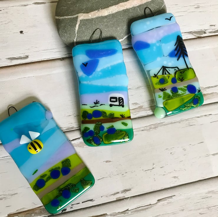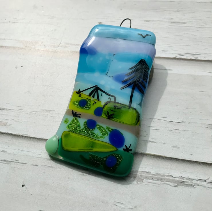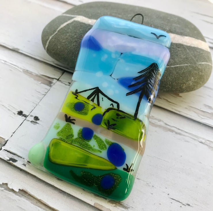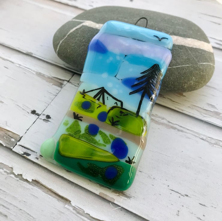 A small fused glass suncatcher featuring a tent. It would look lovely hanging in the window or on the wall and makes an ideal gift for people who love to camp. This is a handmade item, I have individually cut each piece of coloured glass and then fully fused it in the kiln once cold I then hand-painted with enamel the tent and tree details. It measures approximately 8 cm x 4 cm.