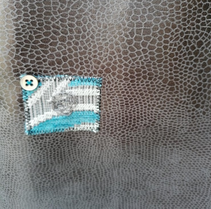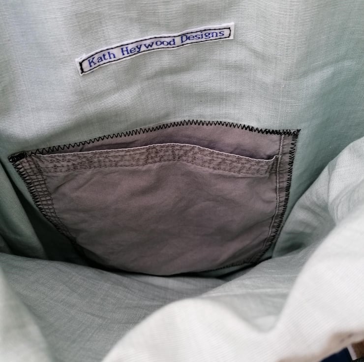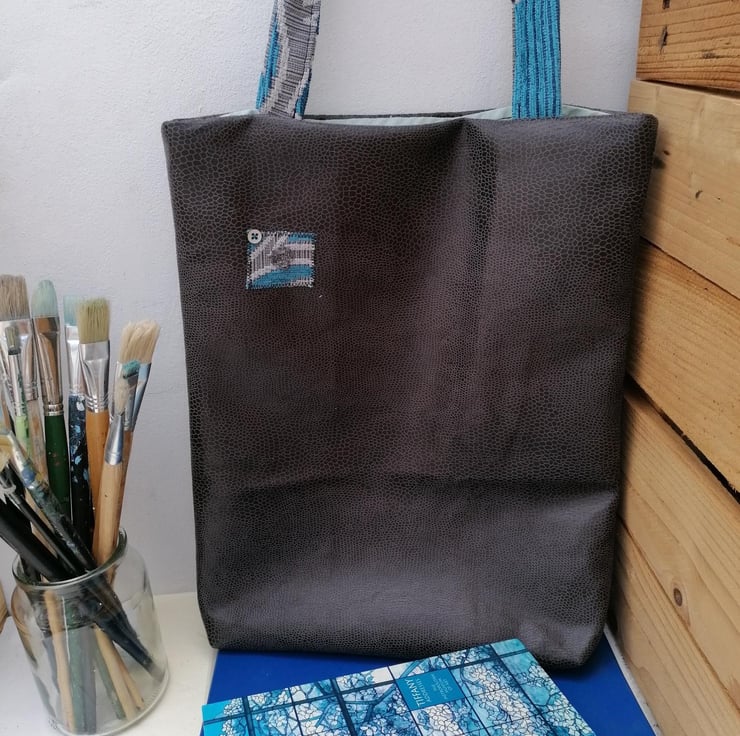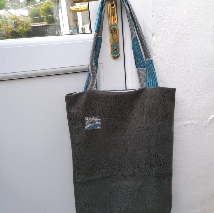This beautiful tote bag is handmade from a gorgeous soft polyvinyl furnishing fabric remnant which has a look of snakeskin. The handles are made from a thick contrasting grey and turquoise textured patterned upholstery fabric from the 80s. I have lined this bag with a light green fabric remnant.