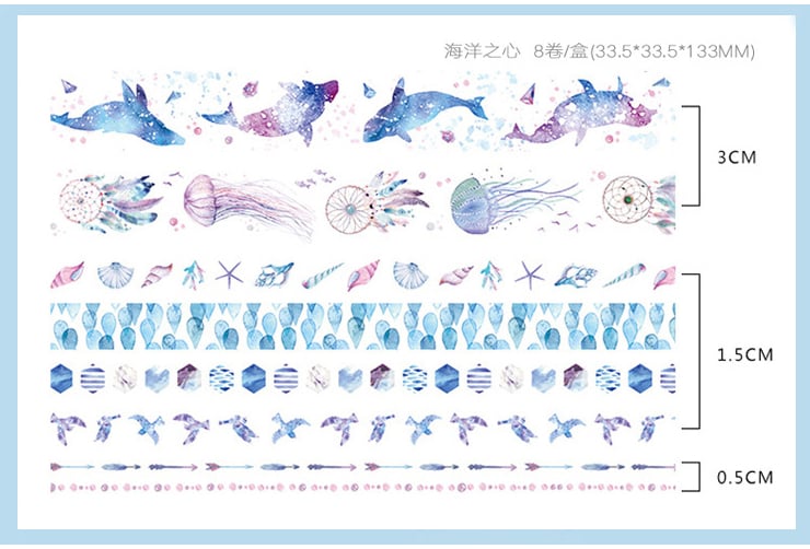 Sea life patterns, whales, jellyfish, starfish, birds, music and planets. Great for all types of craft projects.
