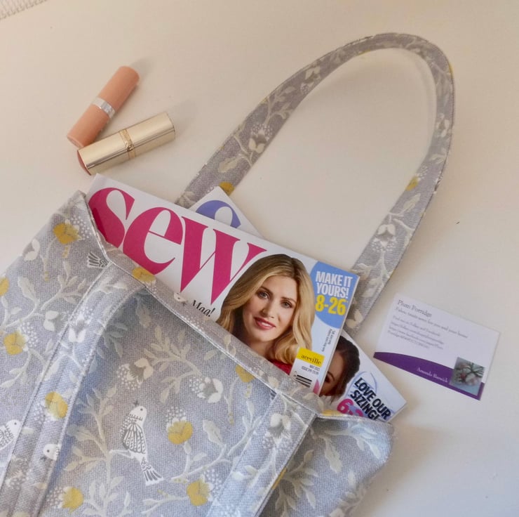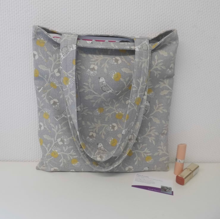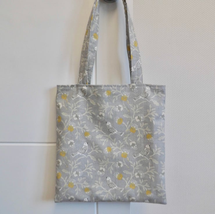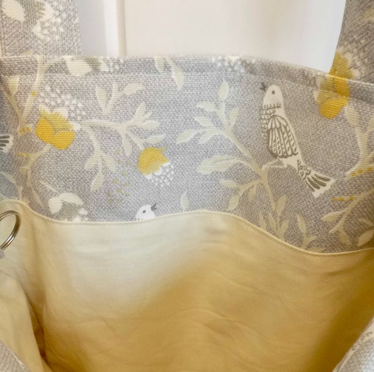 I made this tote bag using a mid-weight cotton fabric which has a grey background and features sweet little birds perched amongst yellow flowers. I faced the top of the bag with the same fabric for a professional finish and then lined the lower half with a cream cotton lining fabric. I inserted a key ring into one of the side seams, useful for clipping keys or purse safely inside your bag.