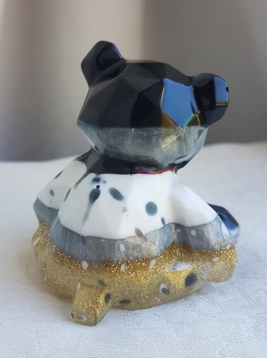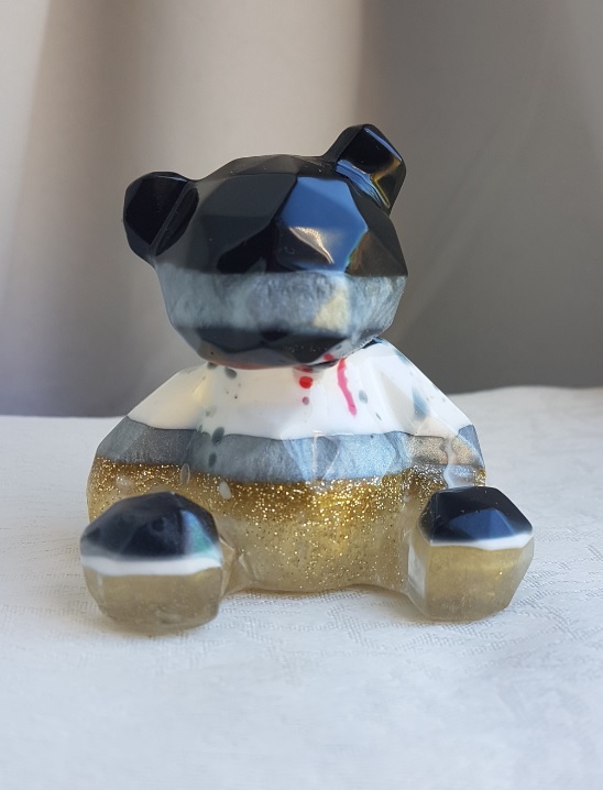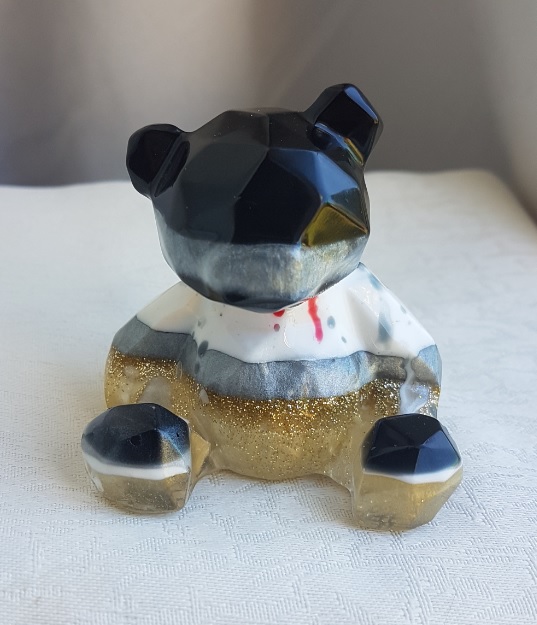 Lovely Stripey Resin Bear, gorgeous in its Black, Silver, White and Gold colours. With random Red layer under its chin and a slight dribble of Red from its neck. You never know how these will turn out as they are made from the last drips of resin left over when mixing for other items. This abstract little bear is an unusual little character and is made over many weeks from layers of colourful resin. This Bear is Numbered 31.