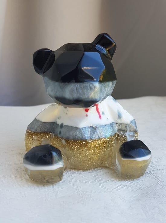 I love these little Bears. They are a great way of using up the dregs that are always left in the cups when I mix resin for other projects. I leave my cups to drain into these Teddy Bear moulds and that ensures I get the most out of all my materials. They take a long time to create and are many individual layers but they are always unique, which is what I love.
