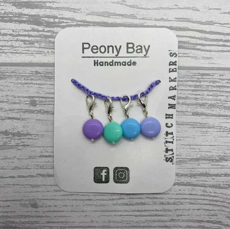 Set of four crochet stitch markers on lobster clasps. The set consists of four stitch markers with purple, green, blue and lilac flat, round plastic beads. This set reminds me of ‘smarties’!