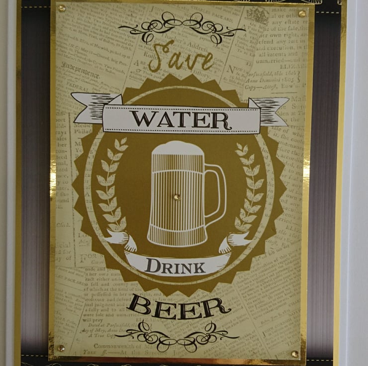 The design is a funny quote - "Save Water Drink Beer". A tankard of beer with froth is in the middle of the design and smaller tankards are in the background across the top and bottom.