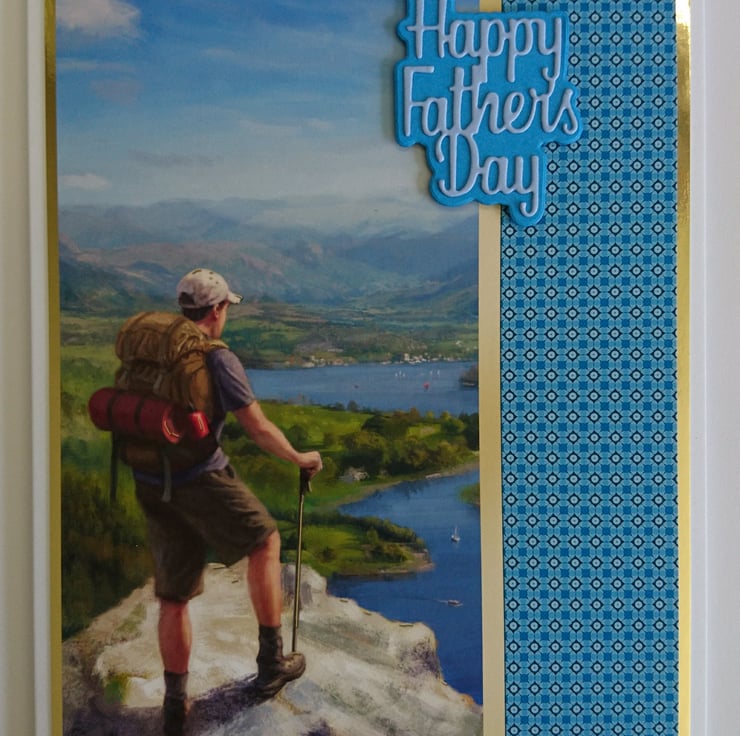 The design is a man standing on the top of a mountain looking at the beautiful scene below of sailing boats on a winding river. He is wearing a hiking backpack with a sleeping bag and is leaning on a walking pole. The 3D sentiment says "Happy Father's Day" and the card is finished with gold gems.