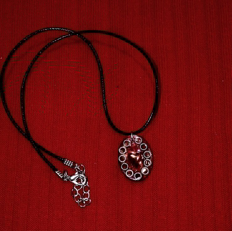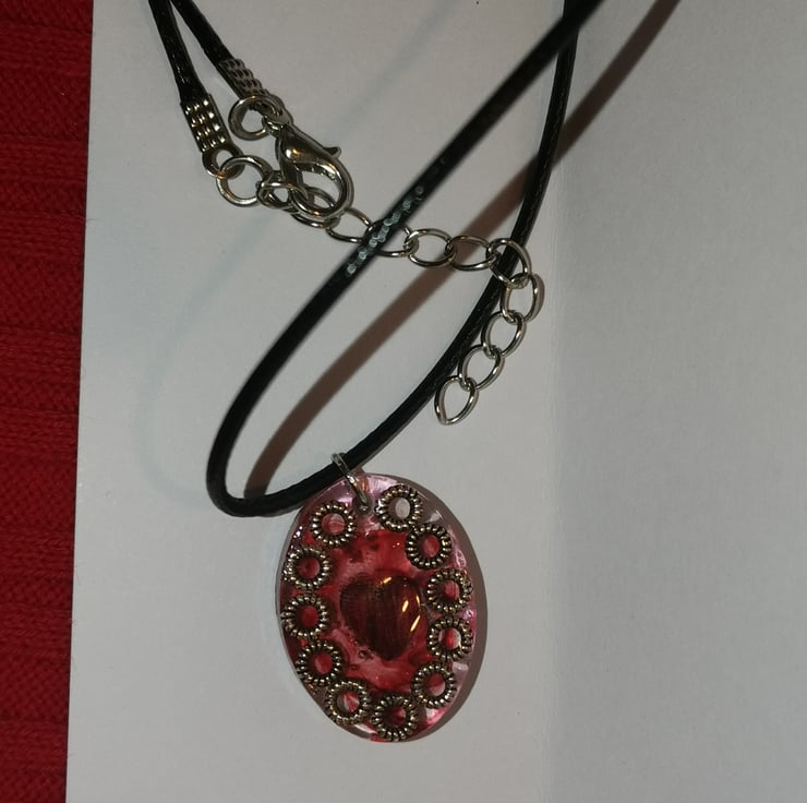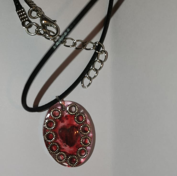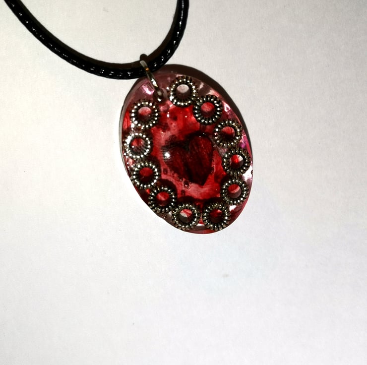 Your beautiful pendant is made of resin which contains a wooden heart that I soaked in red ink ,I surrounded the heart with metal circles to symbolise the love which never ends