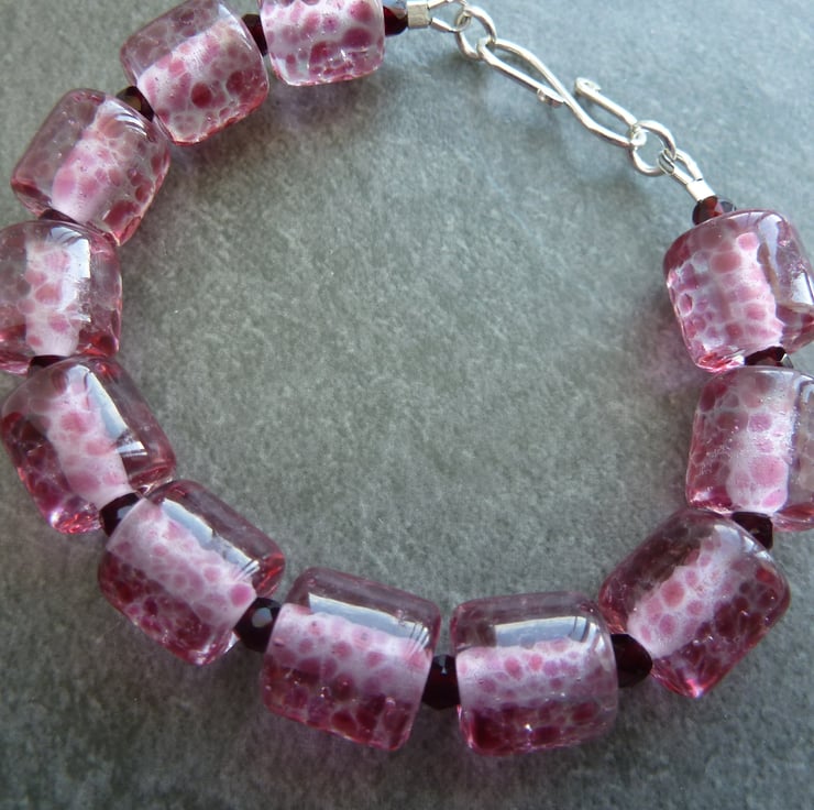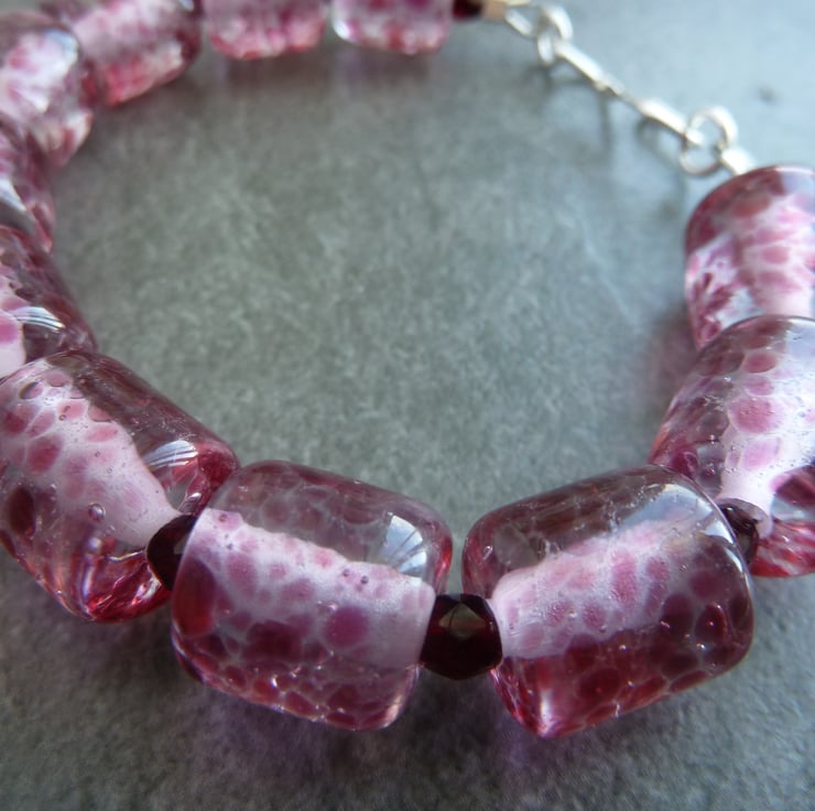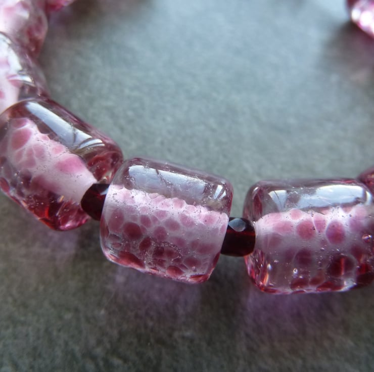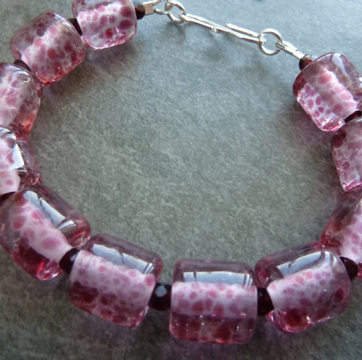 A bracelet made with handmade lampwork glass beads, they have been handmade by me using clearglass with pink speckles.
