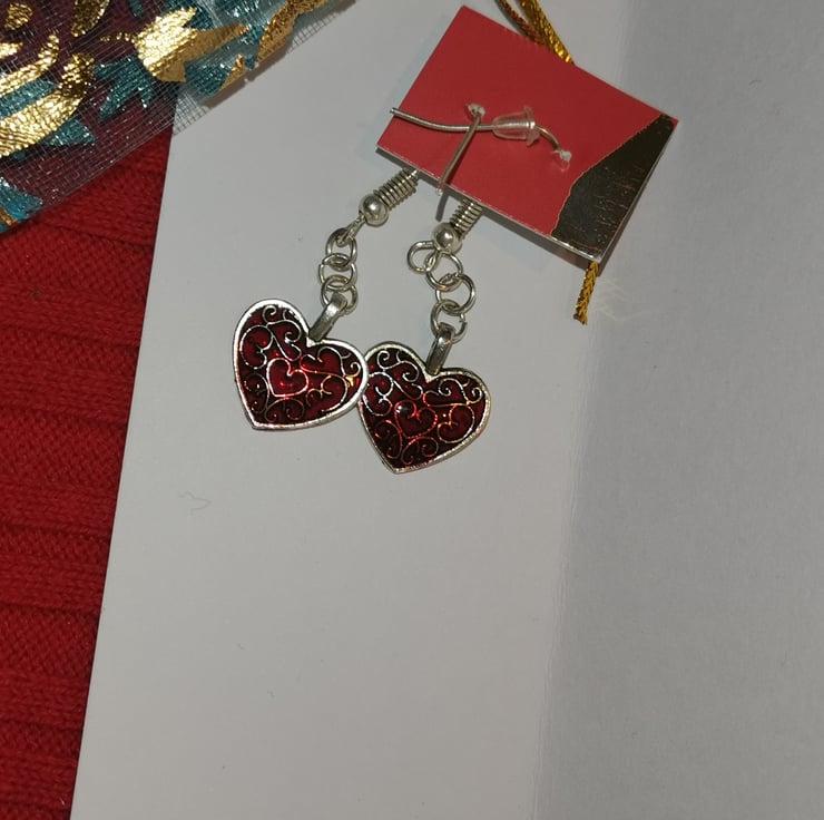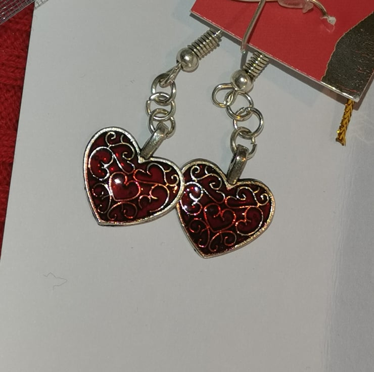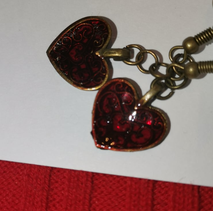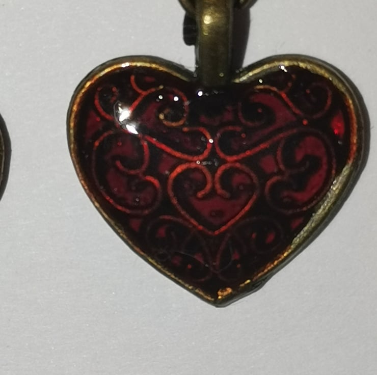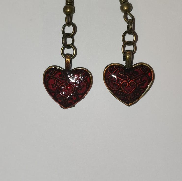 These beautiful earrings have a vintage style design inside the heart which I filled with red ink mixed with clear resin and poured over the hearts filling and coating the vintage design, they are see through when hit by the light