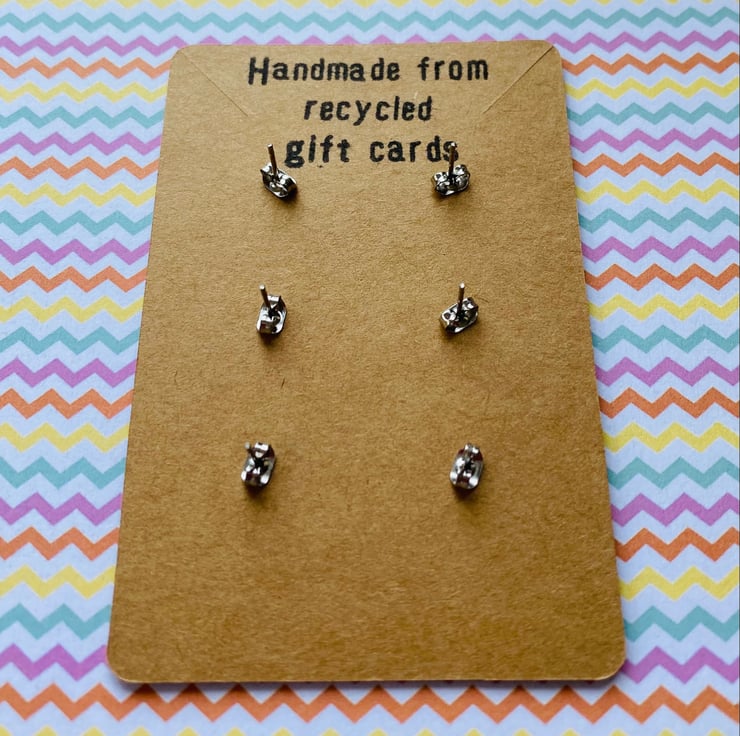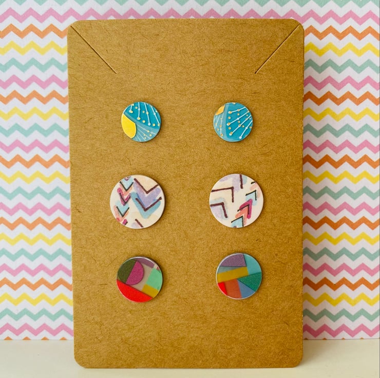 This set of three pairs of studs is perfect as a gift or for those who like a pop of colour! They have been handmade from recycled plastic gift cards, making them an eco-friendly choice. Cut out by hand and smoothed around the edges, they feature bright and vibrant patterns which have been carefully selected from the overall design. You’ll never be short on choice!