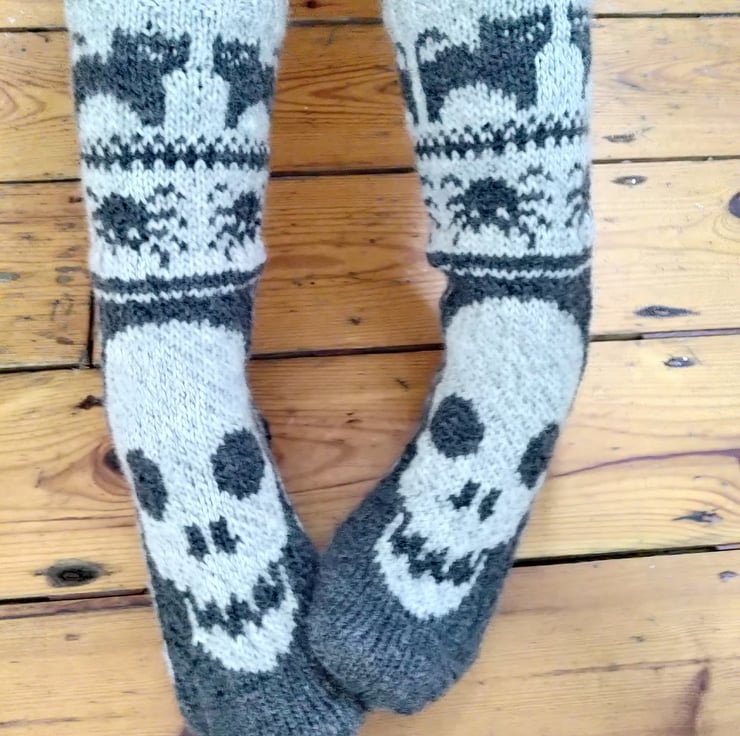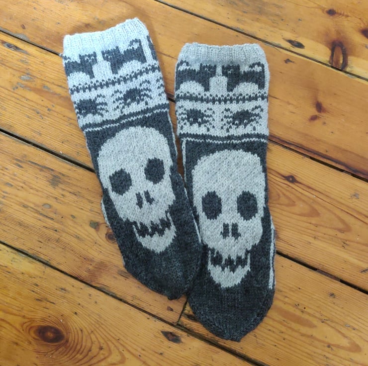Wool socks in dark and light grey yarn featuring cats, spiders and a large skull.