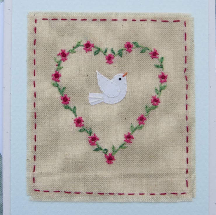 A hand-stitched miniature mounted onto greeting card, with title written beneath: Dove with Love. This carefully worked embroidered miniature is a gift in itself as well as a card in which to write your message - a card to keep. I have embroidered a heart shape of roses and leaves and added a tiny dove in the centre. Delicate and precious-looking, perfect for any special time.