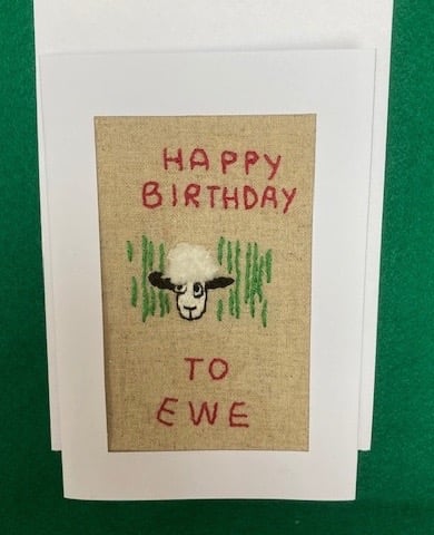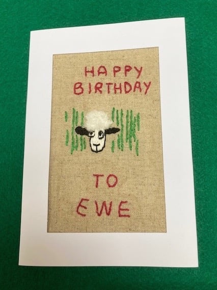 This cute, fluffy sheep is peering out of the grass and wishing a happy birthday. The sheep has been hand embroidered onto light canvas and mounted on a white aperture greetings card 152mm x 104 mm. The inside of the card has been left blank for your own birthday message.