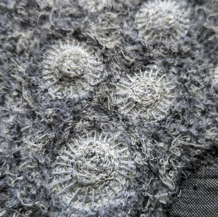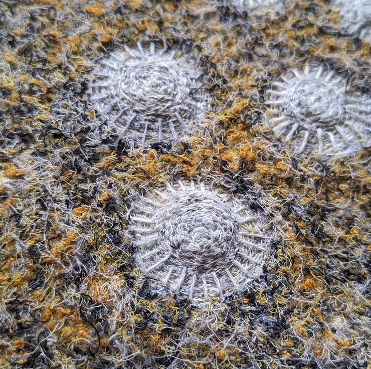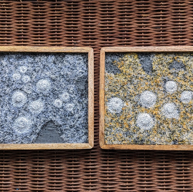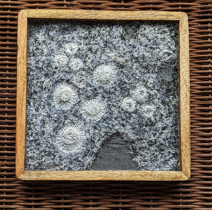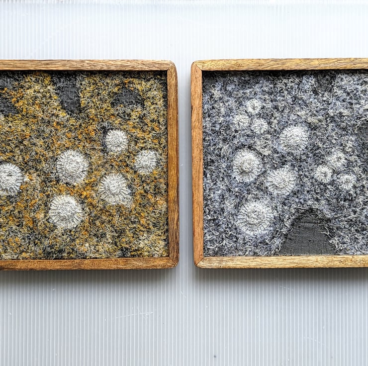 I create coastal inspired textures using a combination of embellishing and embroidery; blending a variety of recycled fabrics to create subtle variations in tone. These are stitched inside waste plastic to cast true to life pieces with cement giving a distinct contrast between the manmade structure of the packaging and the soft natural textures of the textiles.
