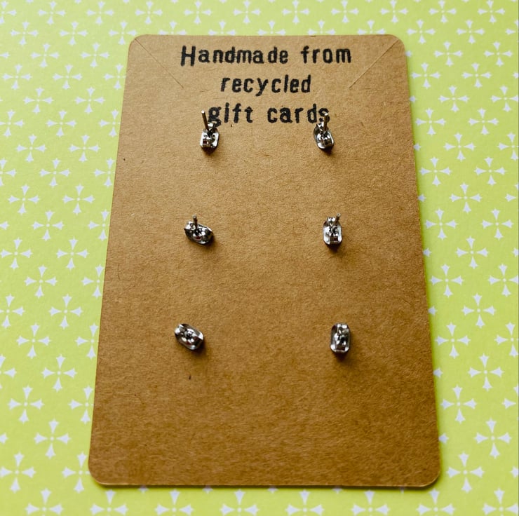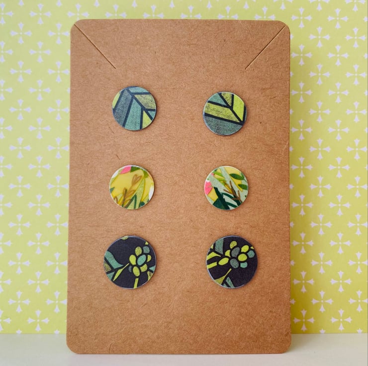 This set of three pairs of studs is perfect as a gift or for those who like a choice! They have been handmade from recycled plastic gift cards, making them an eco-friendly choice. Cut out by hand and smoothed around the edges, they feature leaves and foliage in lovely hues of green which have been carefully selected from the overall design.