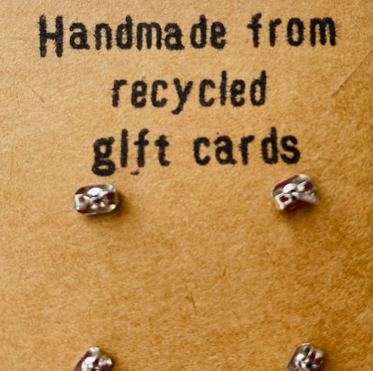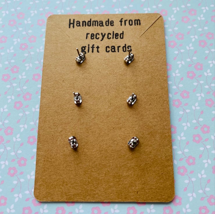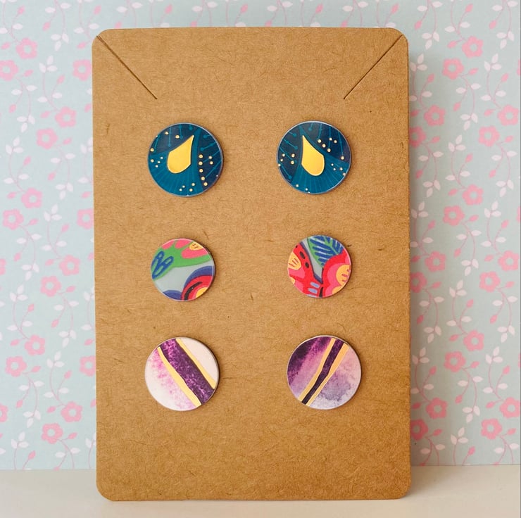 This set of three pairs of studs is perfect as a gift or for those who like a pop of colour! They have been handmade from recycled plastic gift cards, making them an eco-friendly choice. Cut out by hand and smoothed around the edges, they feature bright and vibrant patterns which have been carefully selected from the overall design. You’ll never be short on choice!