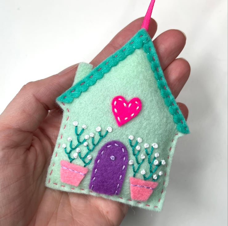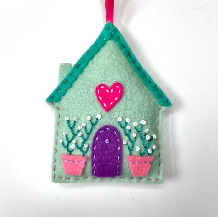 Hand stitched in a soft shade of pale mint wool felt, with embroidered flowers in pots by a little felt appliqué door. The house is finished with a pink coloured heart motif, hand stitched into place.
