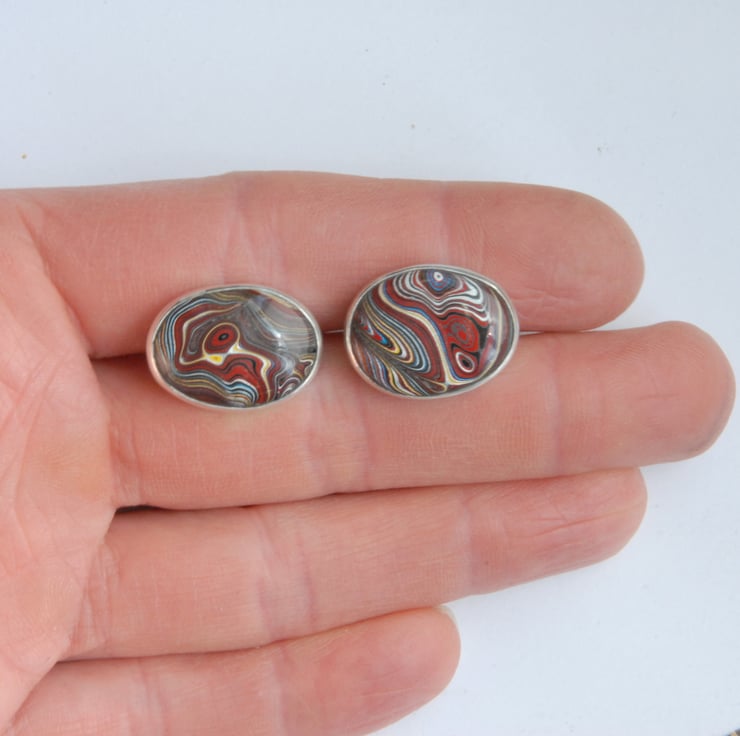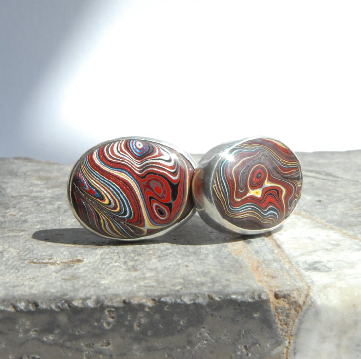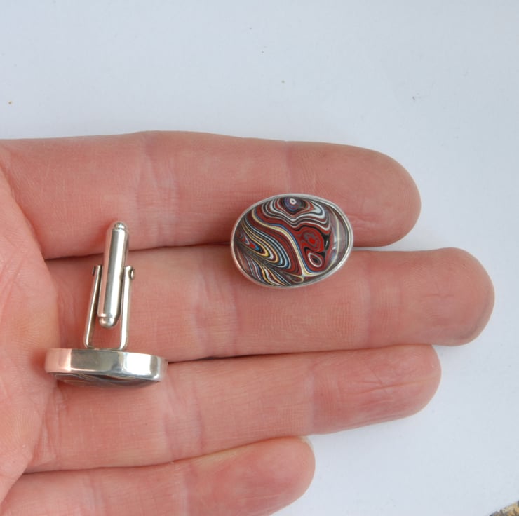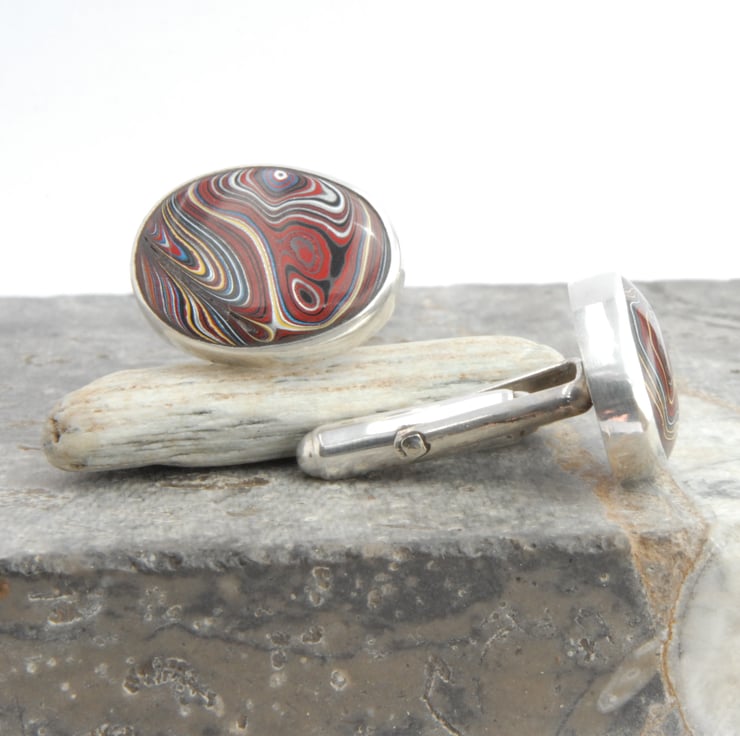 These striking cufflinks feature oval cabochons of corvette fordite smoothly bezel set and finished with sterling silver swivel fittings. Corvette fordite has a characteristic colour palette dominated by rich reds and a swirly pattern in sparkly blue and silver with a little yellow. The cufflinks have a standard swivel fitting making them easy to put on and the rounded shape and profile make them comfortable to wear under jackets. They measure approx 20mm by 15mm (they don't quite match) and come gift boxed, my fordite cufflinks have proven to be a popular wedding anniversary gift.