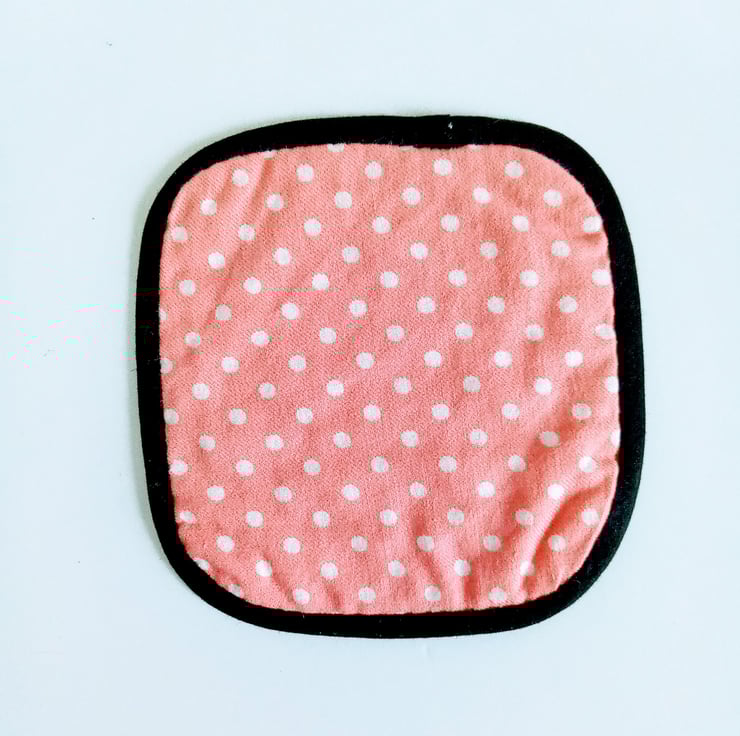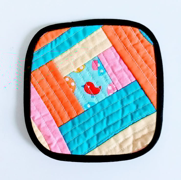 This is a small quilt as you go coaster with a bird design in the centre. It is reversible with a polka dot fabric on the reverse.