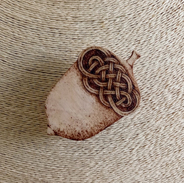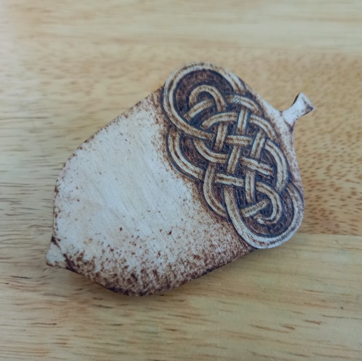 Wooden brooch of an acorn decorated with Celtic knotwork using pyrography (wood burning).