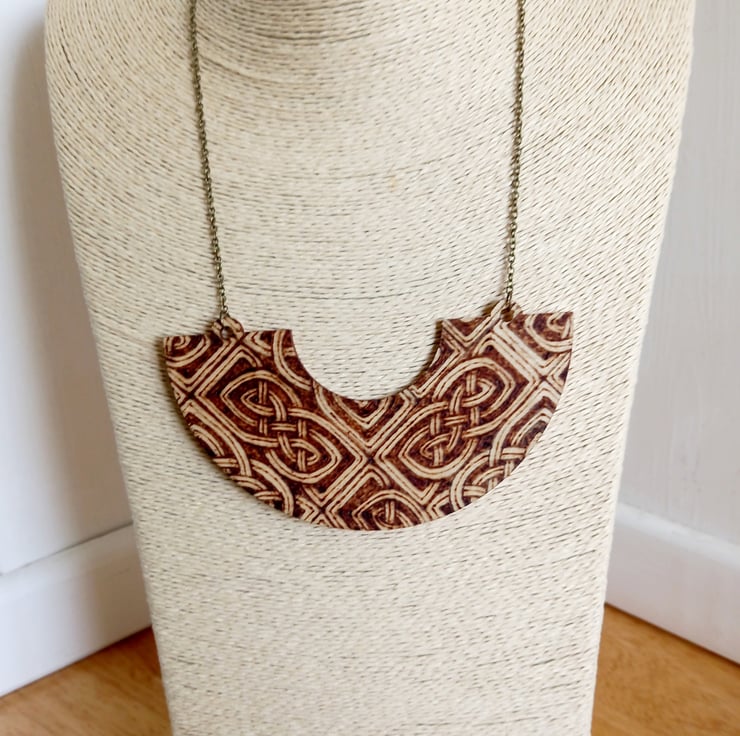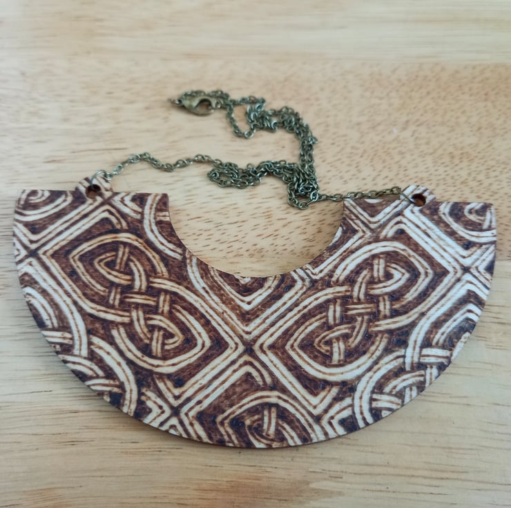 Wooden pendant illustrated with Celtic knotwork using pyrography (wood burning).