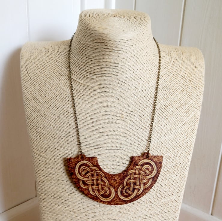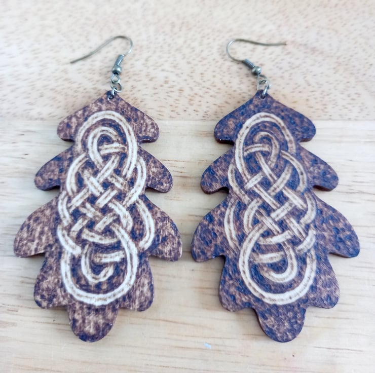 Wooden pendant & earrings illustrated with Celtic knotwork using pyrography (wood burning).