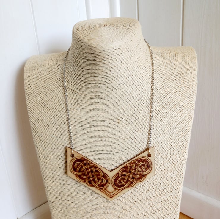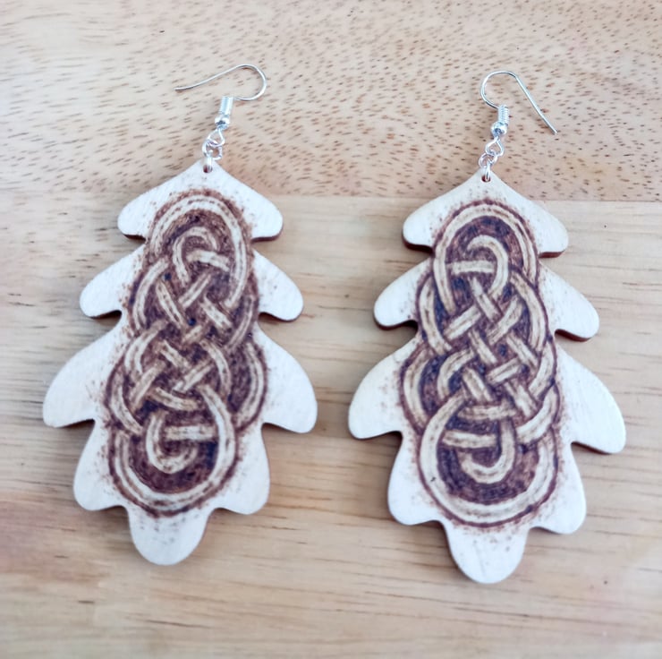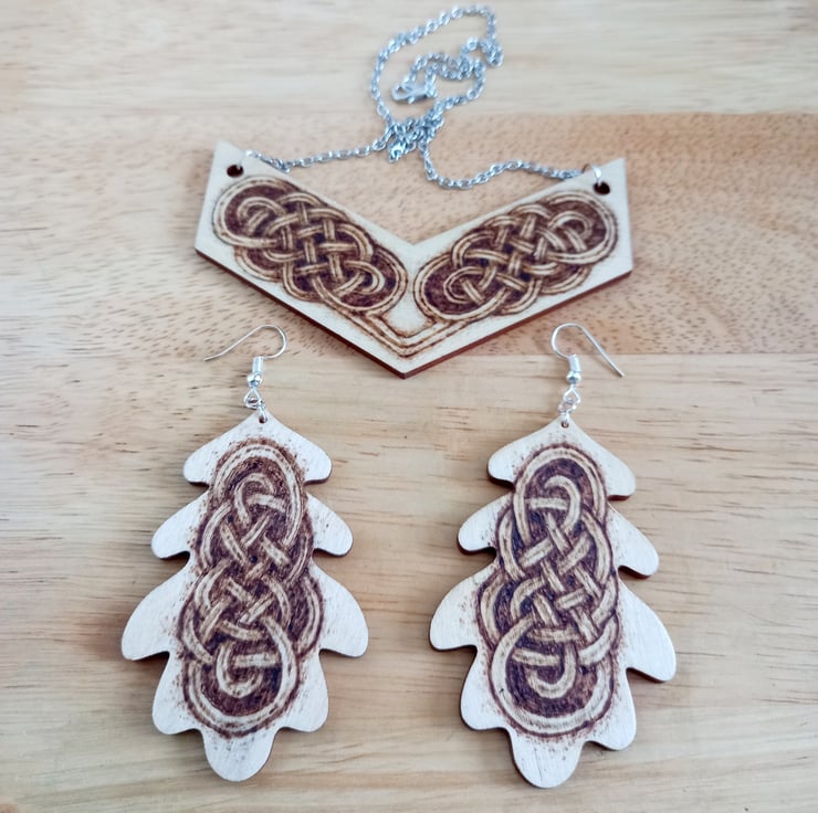 Wooden pendant & earrings illustrated with Celtic knotwork using pyrography (wood burning).