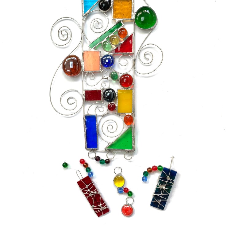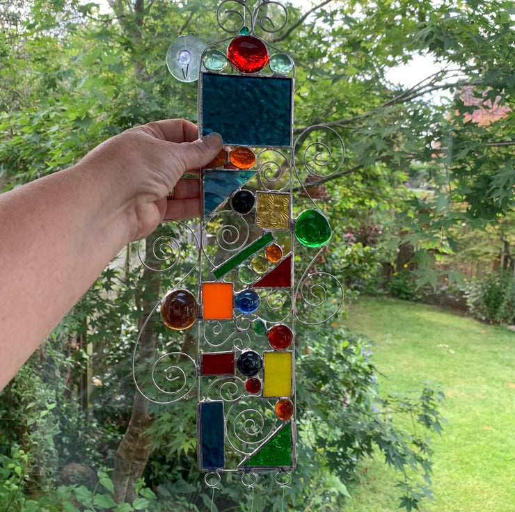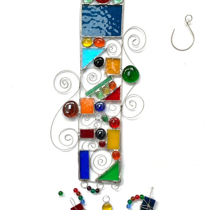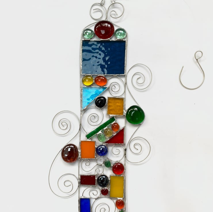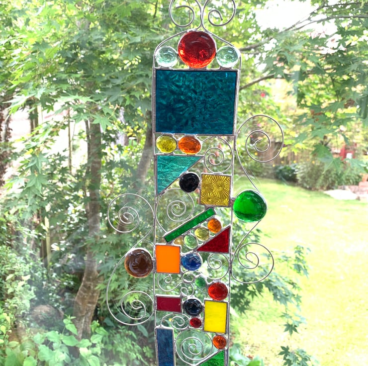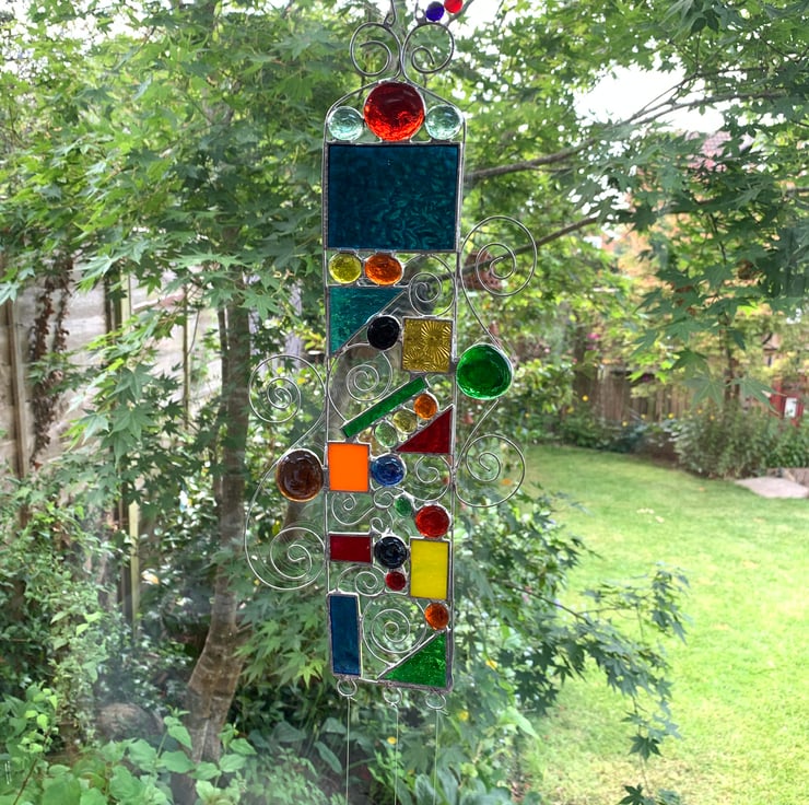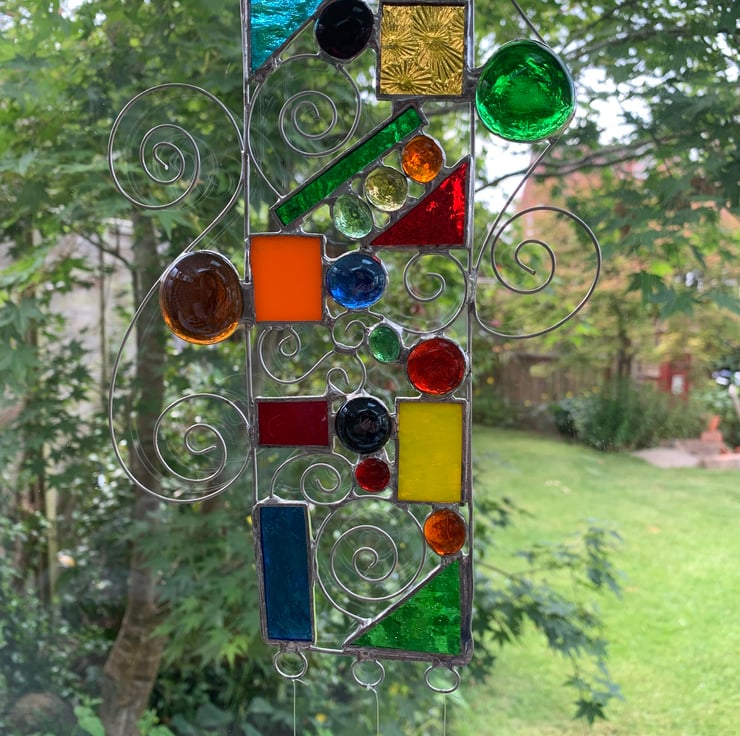 This garden hanger has been made with lots of different coloured stained glass with lots of textures for added interest, glass nuggets and scrolls of tinned wire.