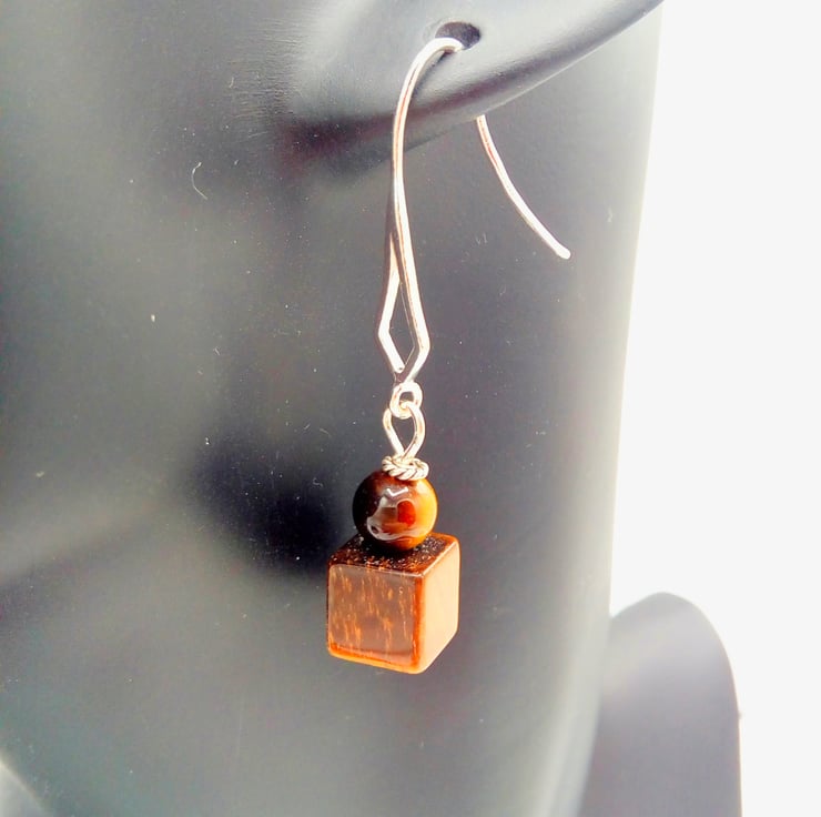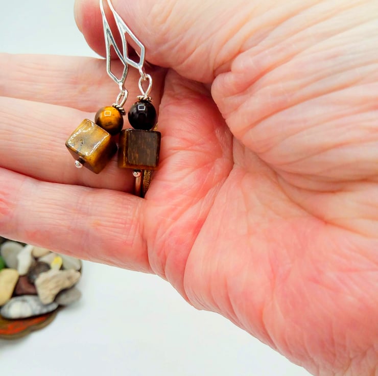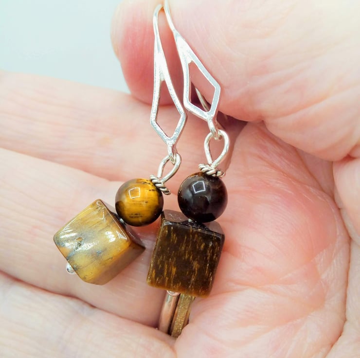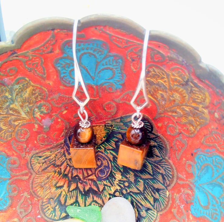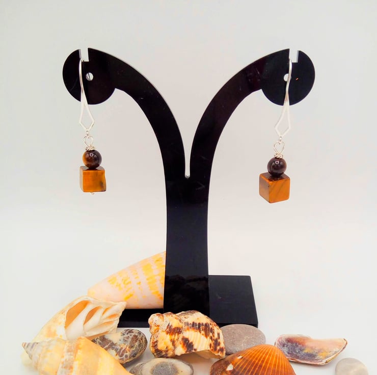 These stunning sterling silver and tiger's eye earrings would go well with any outfit you choose to wear everyday or for an evening out. They would make the perfect gift for a friend or relative for a birthday or anniversary, or a treat for yourself. They are made using 8 mm cube brown tiger's eye beads, with a 6 mm round brown tiger's eye bead. They are suspended on sterling silver diamond patterned long ear wires and they have a drop of 2 cm from the base of the ear wire. The earrings will be dispatched wrapped in tissue paper in an organza bag and delivered to you via Royal Mail first class post.