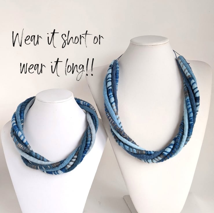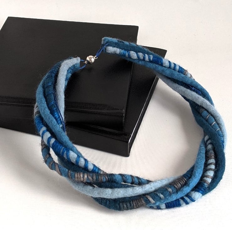 This handmade wet felted necklace twists together felted cords of soft merino wool in shades of denim blue, wrapped with a lustrous merino and silk blend yarn, adding flashes of toning blues and greys. It closes with a strong magnetic fastening.