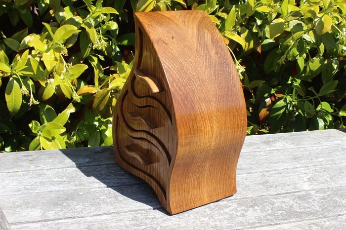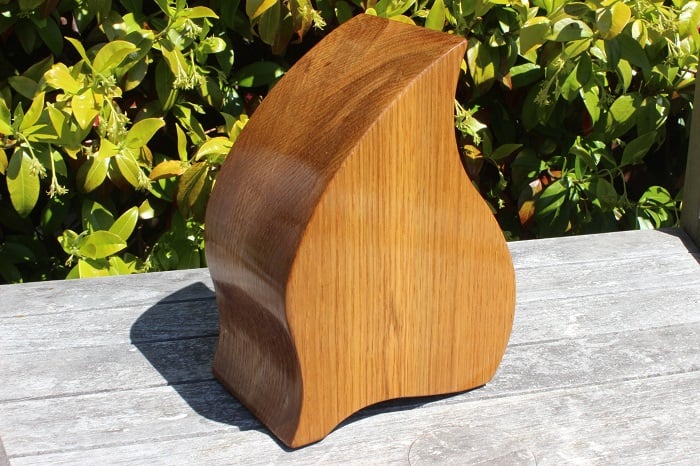 A distinctive jewellery or trinket box with three draws designed in the form of a flame. The box is made from oak wood and finished in multiple coats of drying oil providing a durable deep satin finish. The draws are lined in soft, deep red coloured flocking. Four soft felt feet are mounted on the underside.