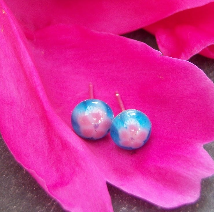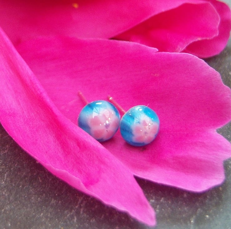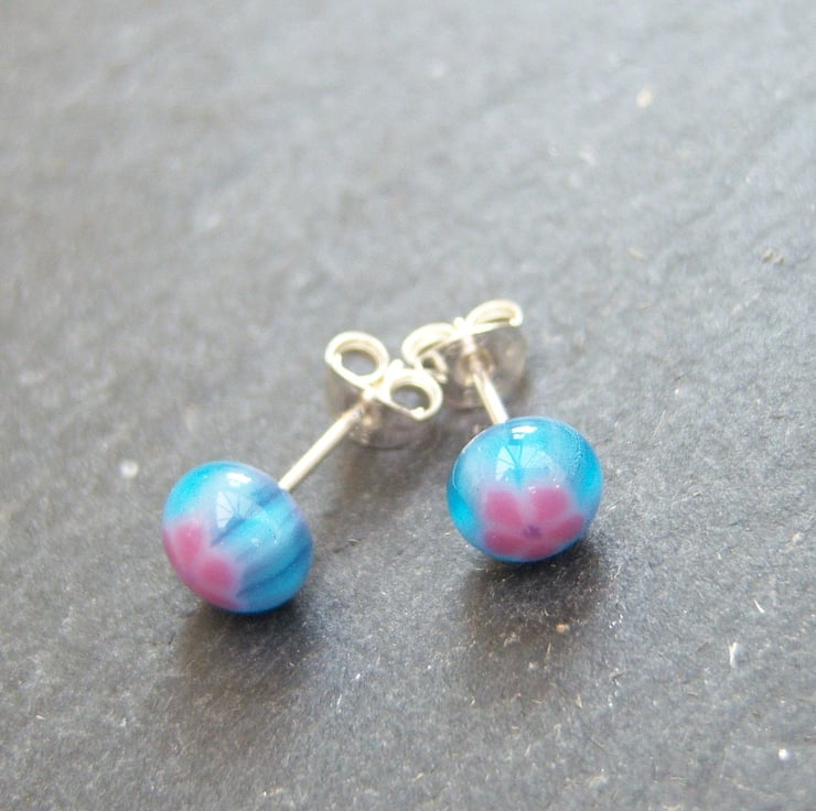 Tiny glass studs. Pale blue stripe with pink flower centre. Approximately 7mm across. Sterling silver posts and butterfly scrolls.