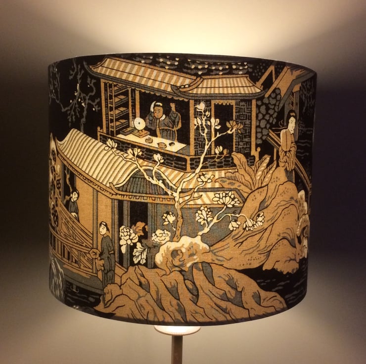 Oriental Scene MANDARIN GARDEN, Elegant Chinoiserie Style Black and Gold Vintage Fabric Lampshade - a Sanderson circa 80s?