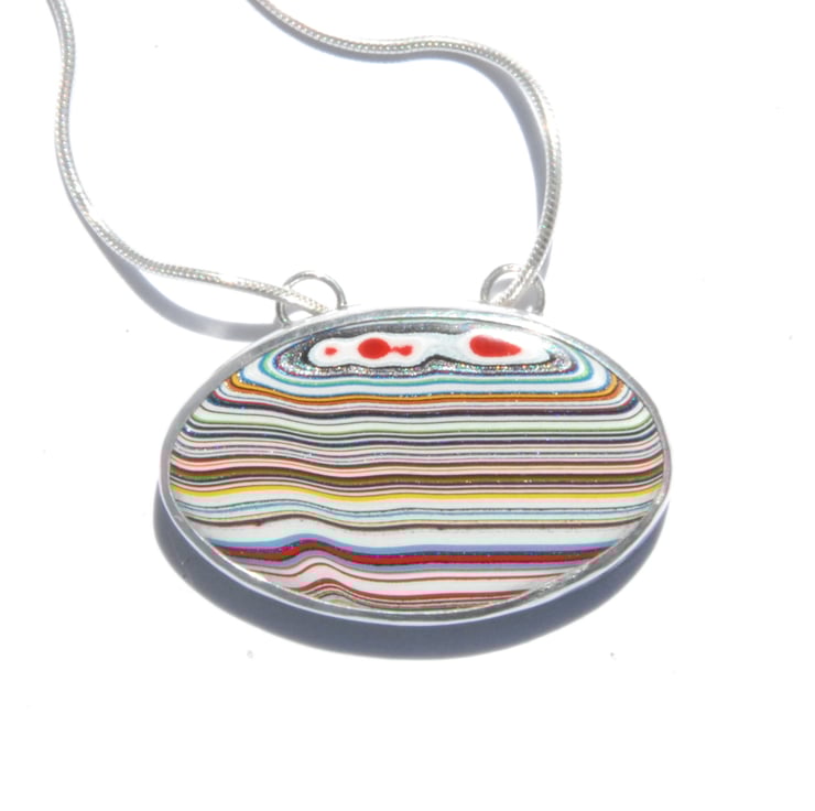 This pendant features a oval of stripey fordite which has been bezel set and mounted landscape rather than the more common portrait way round, the multi coloured stripes run horizontally across the piece.The sterling silver setting runs smoothly along a silver snake chain, the setting is open backed making it reversible but the front looks better. Measures 34mm by 21mm (exc bail) and comes on an 18 inch chain, if you'd prefer a different length please drop me a message.