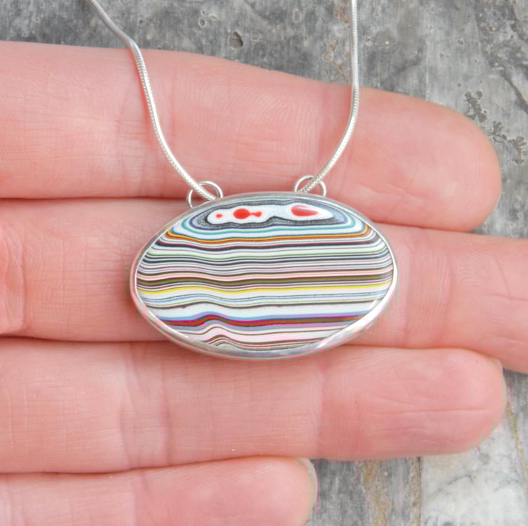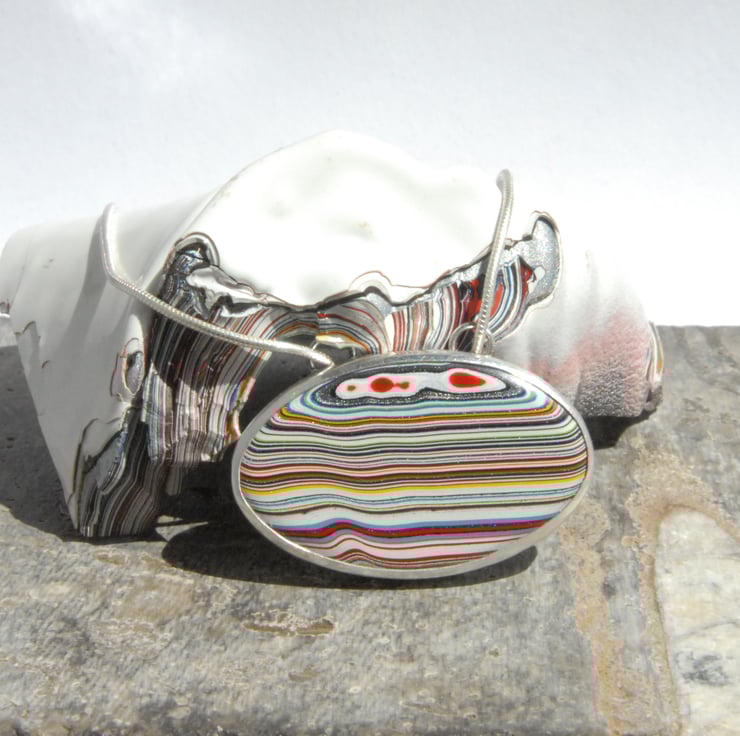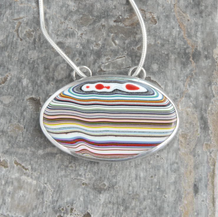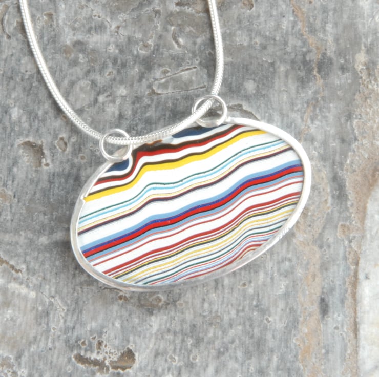 This pendant features a oval of stripey fordite which has been bezel set and mounted landscape rather than the more common portrait way round, the multi coloured stripes run horizontally across the piece.The sterling silver setting runs smoothly along a silver snake chain, the setting is open backed making it reversible but the front looks better. Measures 34mm by 21mm (exc bail) and comes on an 18 inch chain, if you'd prefer a different length please drop me a message.