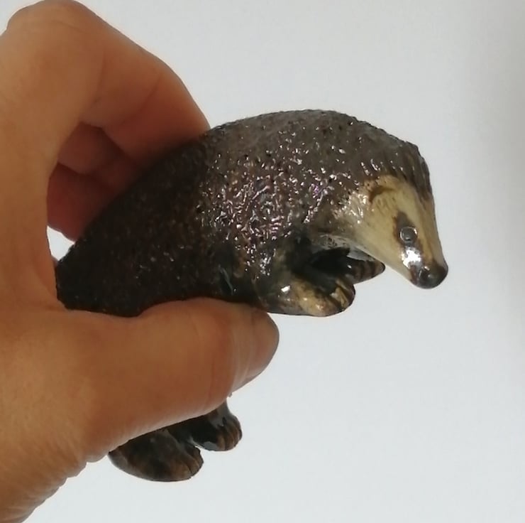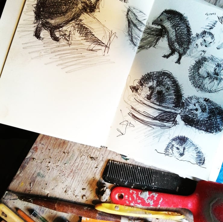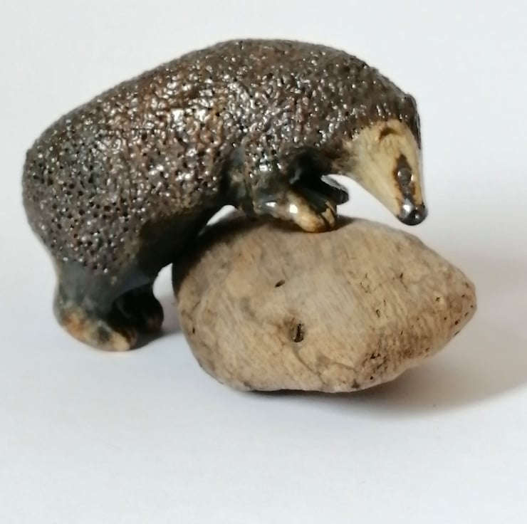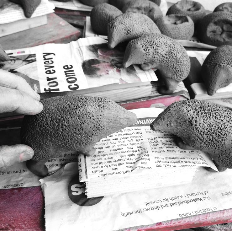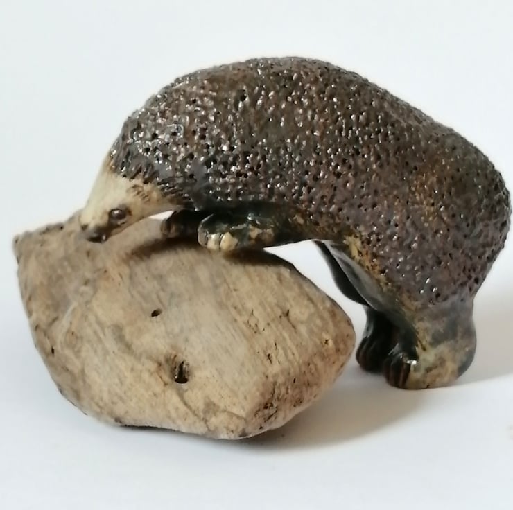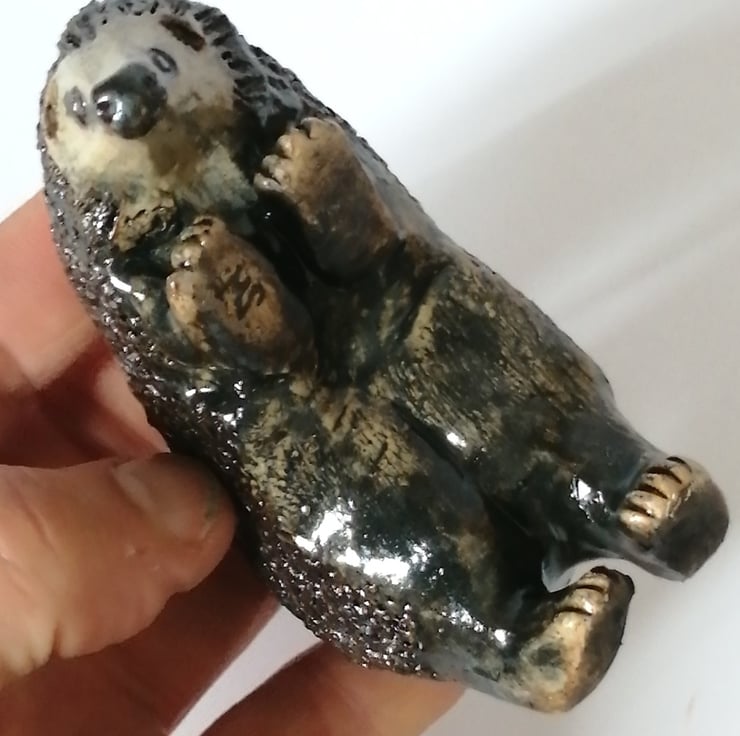 After careful drying, the hedgehog can then be placed in the kiln for a first firing before being painted with various oxides and stoneware glazes to enhance the form, define facial features and textured surfaces.