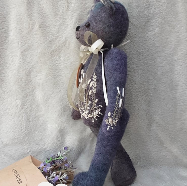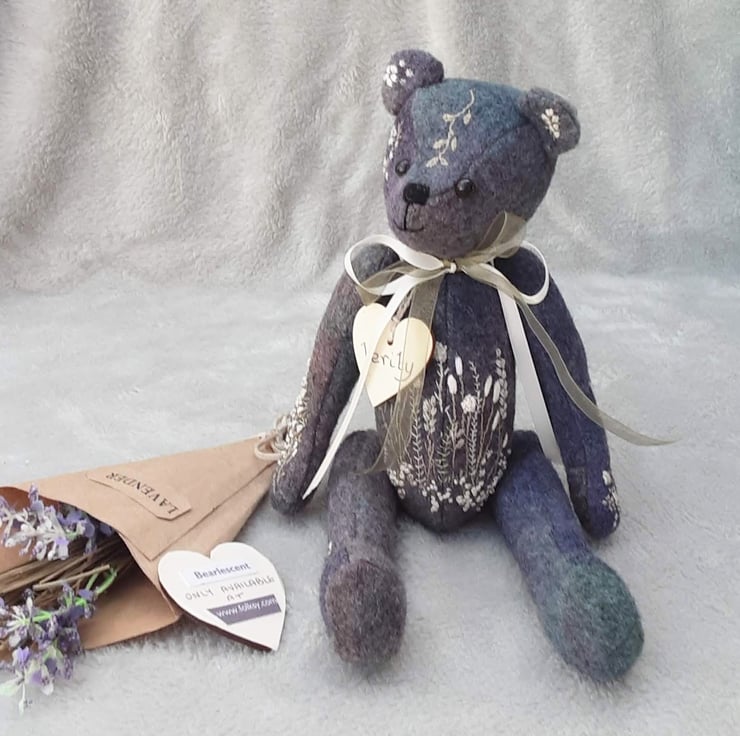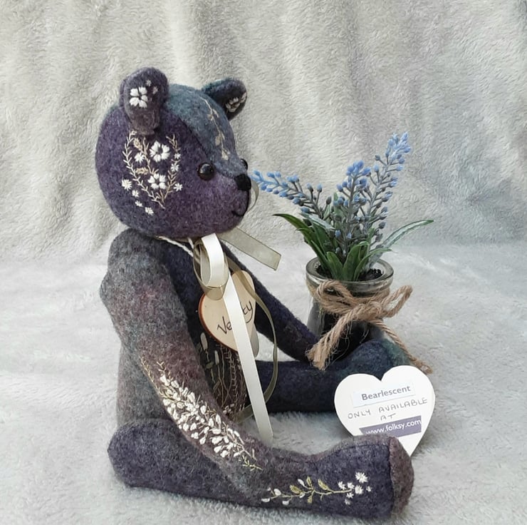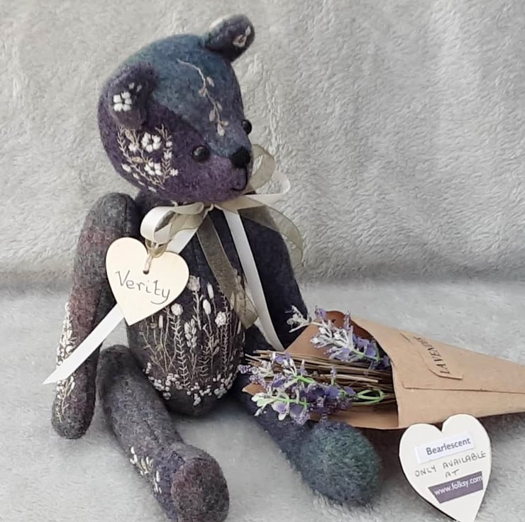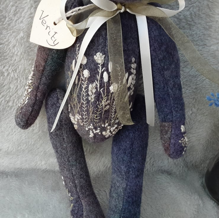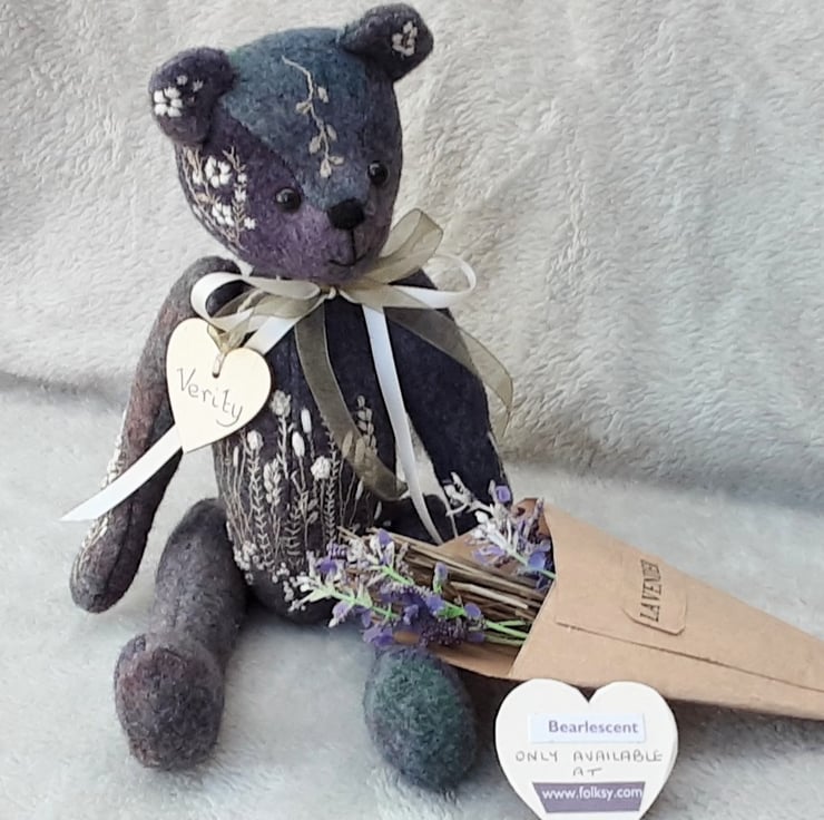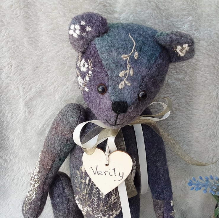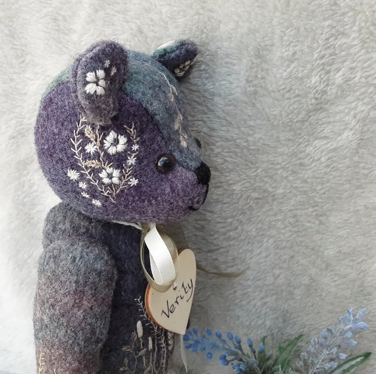 Meet Verity, a unique hand embroidered bear, hand made using hand dyed alpaca fabric in purples and blues with splashes of green and pink.